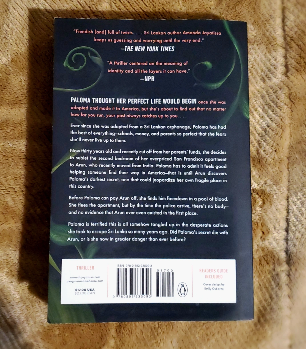Paperback novel My Sweet Girl by Amanda Jayatissa The cover has some minor wear. WINNER: ITW THRILLER AWARD FOR BEST FIRST NOVEL “My Sweet Girl pushes the boundaries of what a thriller can do.”—The Washington Post “Fiendish [and] full of twists…. Sri Lankan author Amanda Jayatissa keeps us guessing and worrying until the very end.” —The New York Times Paloma thought her perfect life would begin once she was adopted and made it to America, but she’s about to find out that no matter how far you run, your past always catches up to you… Ever since she was adopted from a Sri Lankan orphanage, Paloma has had the best of everything—schools, money, and parents so perfect that she fears she'll never live up to them. Now at thirty years old and recently cut off from her parents’ funds, she decides to sublet the second bedroom of her overpriced San Francisco apartment to Arun, who recently moved from India. Paloma has to admit, it feels good helping someone find their way in America—that is until Arun discovers Paloma's darkest secret, one that could jeopardize her own fragile place in this country. Before Paloma can pay Arun off, she finds him face down in a pool of blood. She flees the apartment but by the time the police arrive, there's no body—and no evidence that Arun ever even existed in the first place. Paloma is terrified this is all somehow tangled up in the desperate actions she took to escape Sri Lanka so many years ago. Did Paloma’s secret die with Arun or is she now in greater danger than ever before?