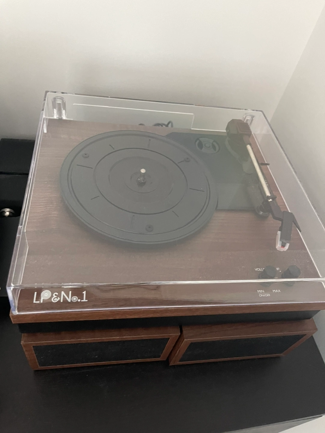Record player with a clear dust cover and built-in speakers. Has volume and on/off controls.