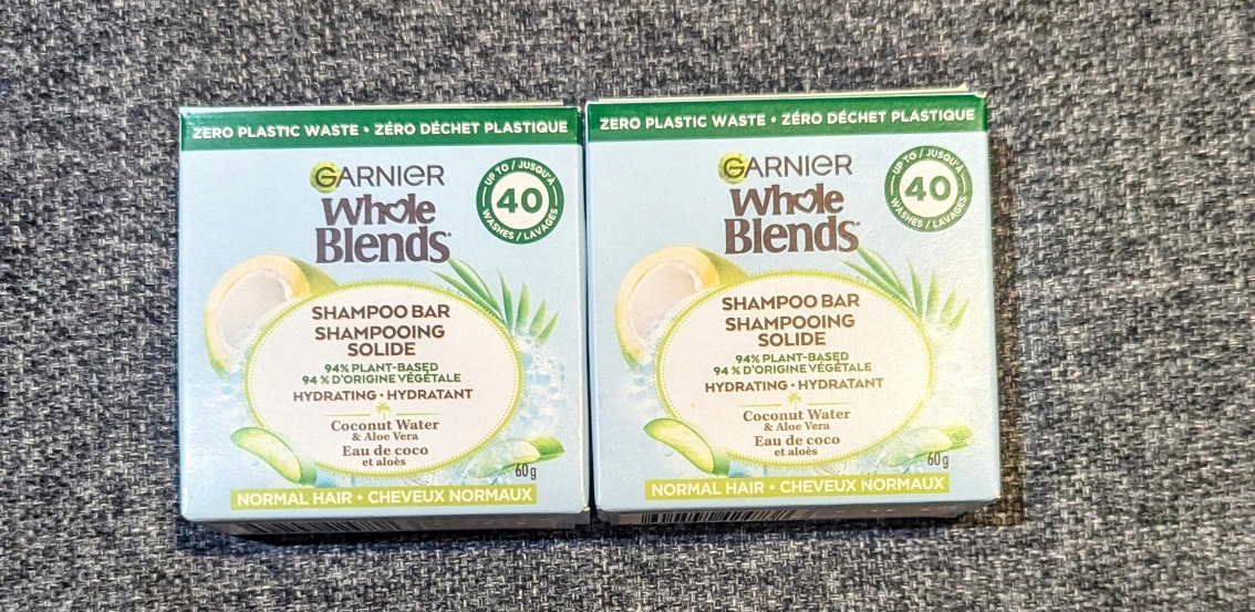 Brand new in box. $5 each. Garnier Whole Blends coconut water & Aaoe vera shampoo bars. Each bar is 60g and designed for normal hair. Up to 40 washes. Vegan formula. Cruelty-free. Does not contain preservatives and soap silicone.
