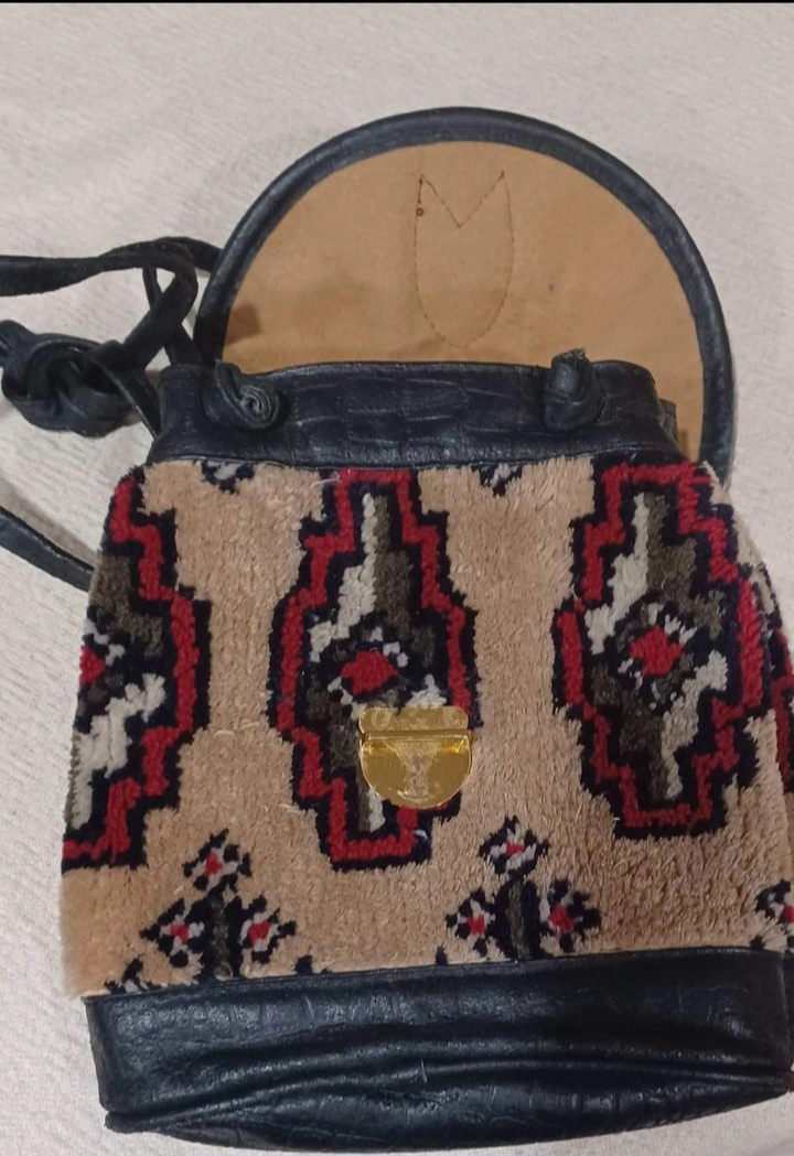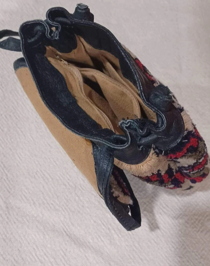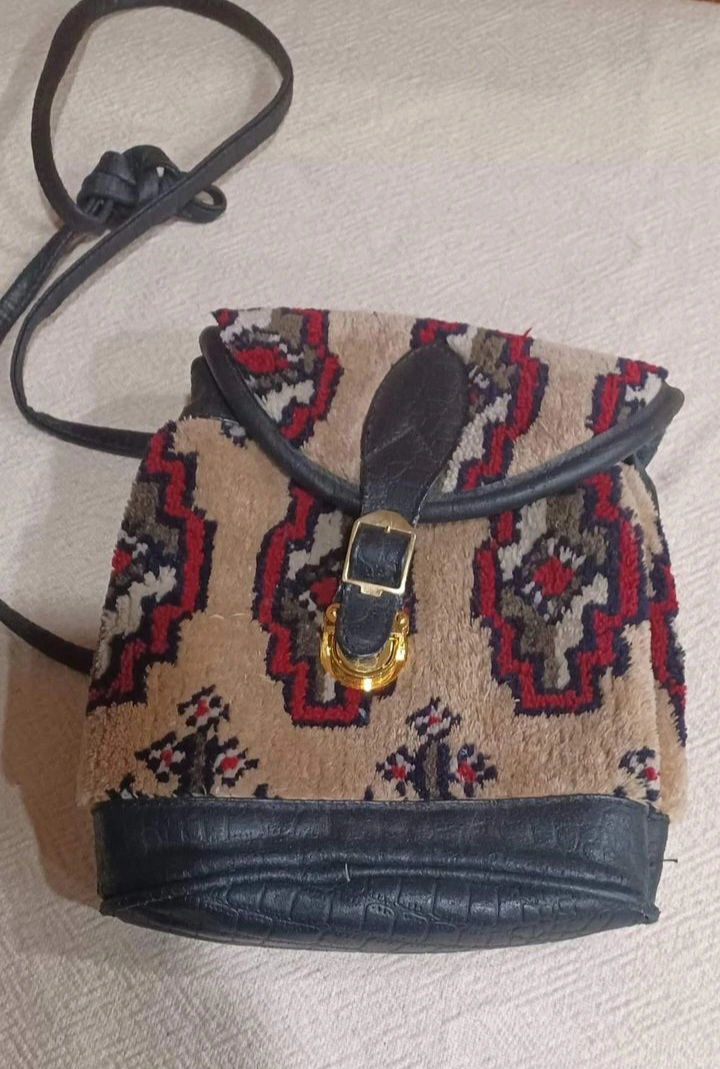 Bag with a unique patterned fabric. Features a buckle closure and a long strap. Interior features two pockets. Black part is leather Dimension 8'x10"