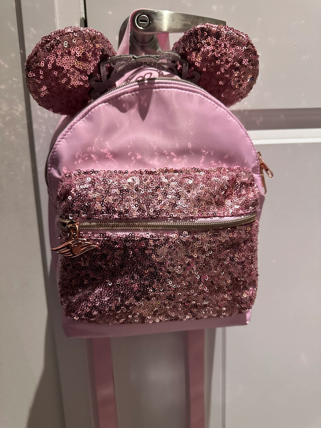 Disney Minne Mouse pink backpack from Bibbidi Bobbidi Boutique in Disney Cruiseline. New condition except the top crown has a small rip, should be easy to fix with glue/sewing. Approximate size: 21 cm x 30 cm x 11 cm.