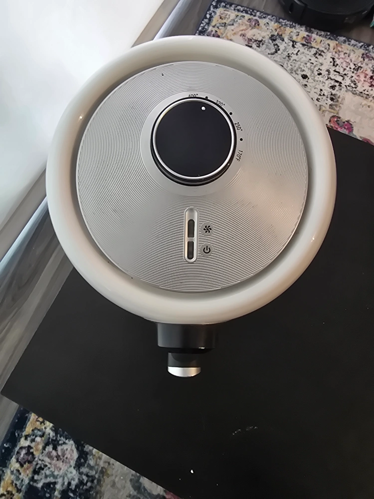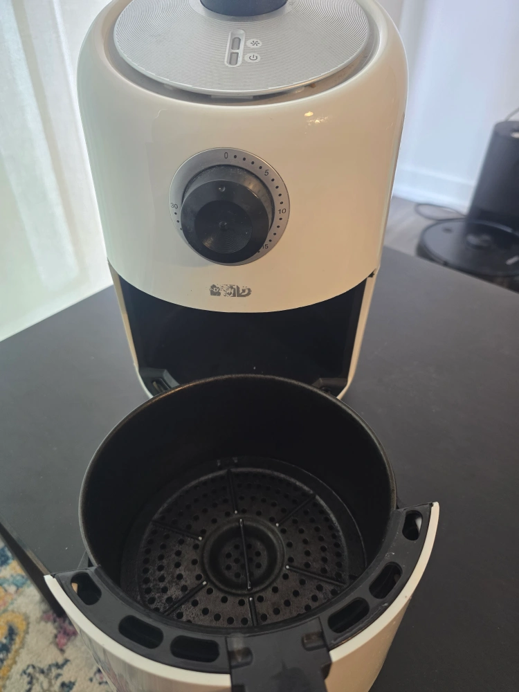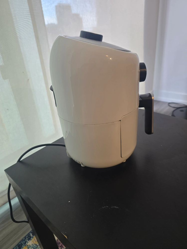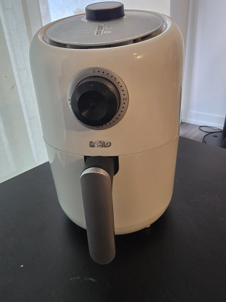 White air fryer with a capacity of 3.7L. Features a timer knob, temperature control knob, and a power button. Includes a removable non-stick basket.