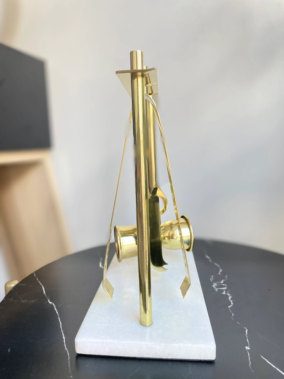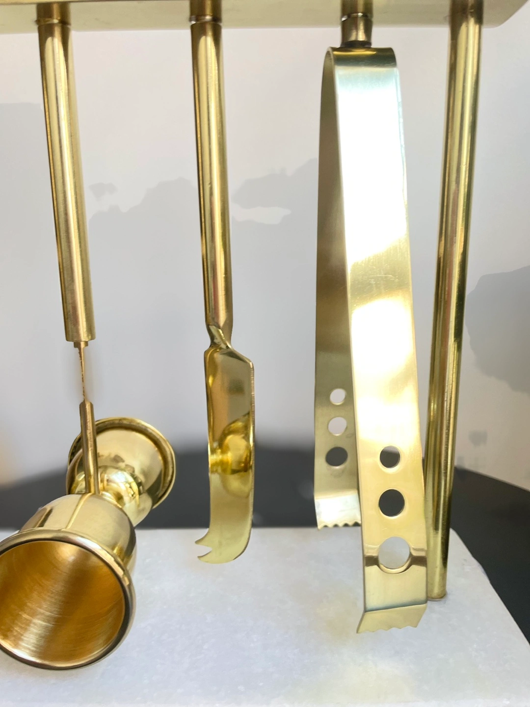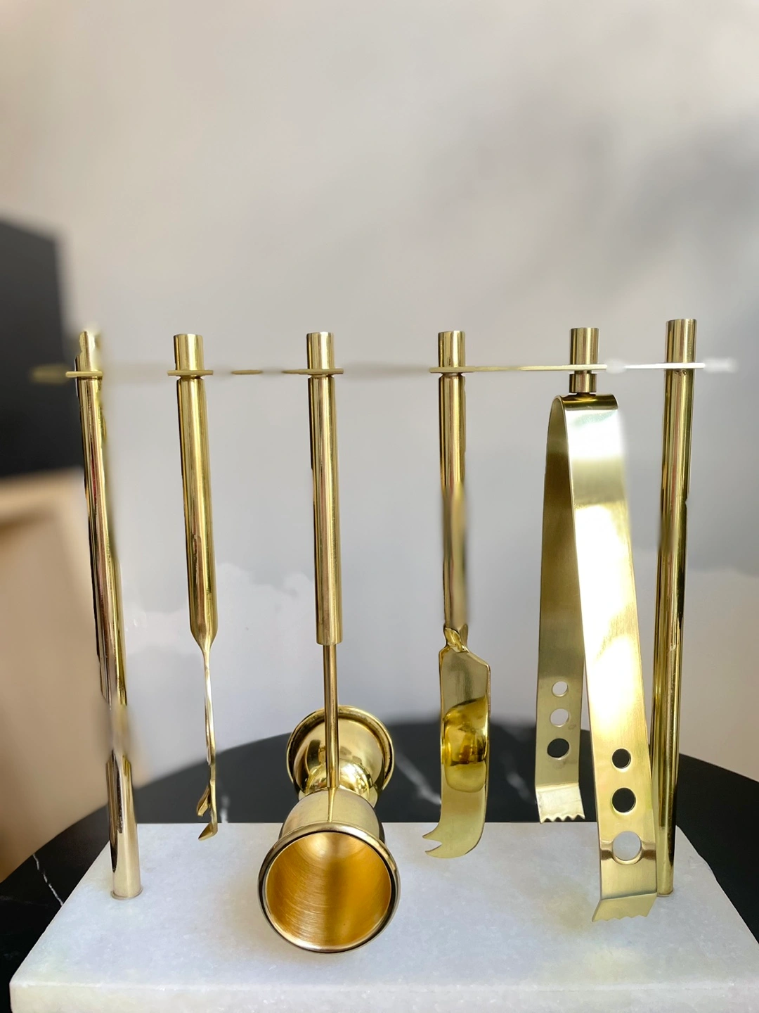 Gold bar set with a marble base. Includes a cocktail shaker, a muddler, a bar spoon, a jigger, a knife, and tongs.