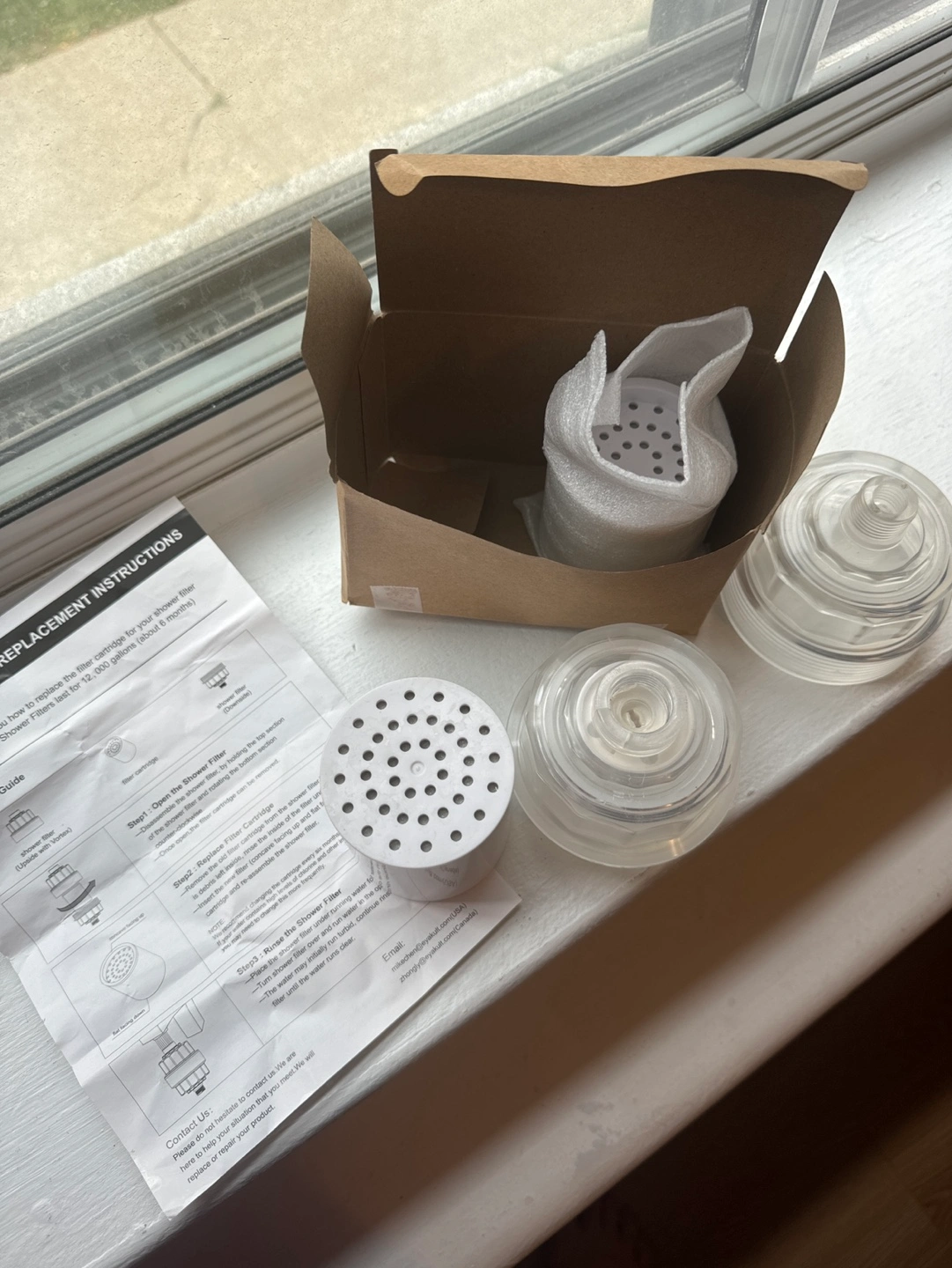 Replacement cartridge for a shower filter. Includes two cartridges and a shower head.