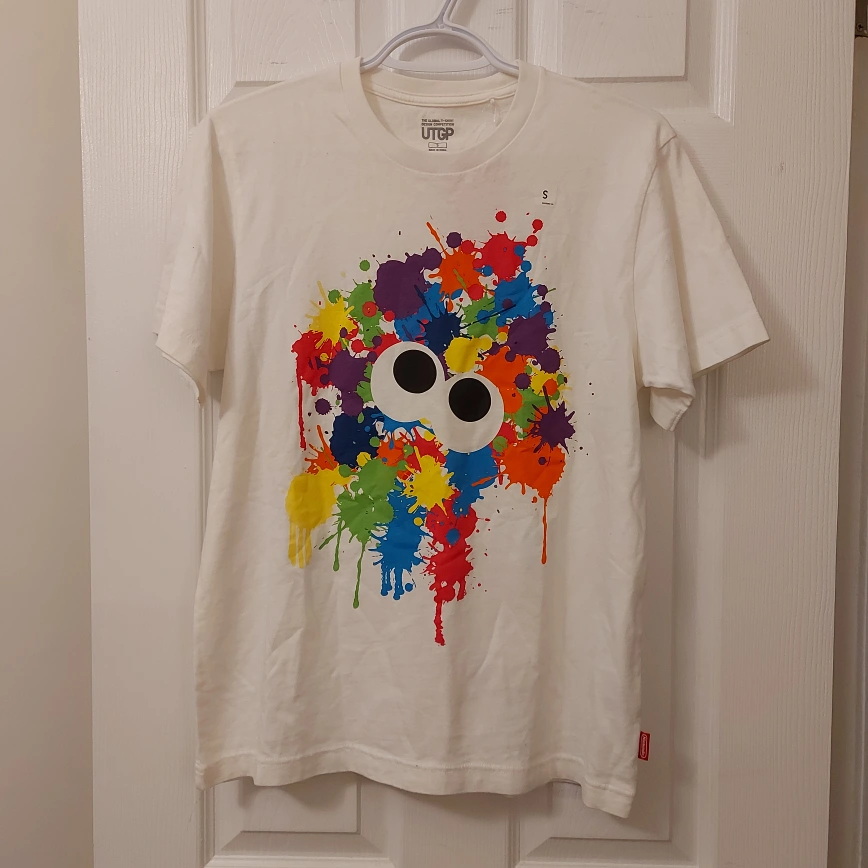 White T-shirt with a Splatoon design. Size S. UTGP The Global T-Shirt Design Competition. Just been collecting dust in my closet. tags still attached. Only worn to try on. Exact amount in cash please. Pick up at Pape Station. I'm free most evenings after 6pm during the week.