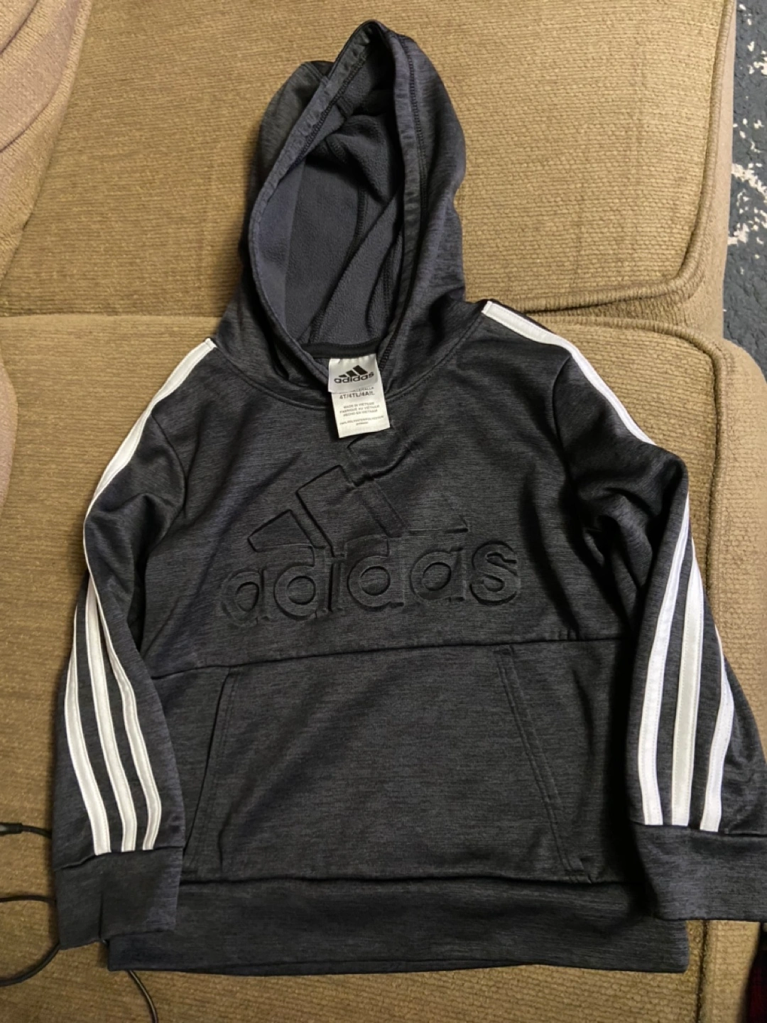Dark grey hoodie with white stripes and a large Adidas logo on the front. The hoodie is in really good condition. Grey Nike hoodie and black panther almost new hoodie Please see pictures for sizes. All for around 4-6 year olds I would say