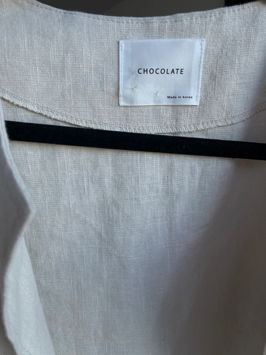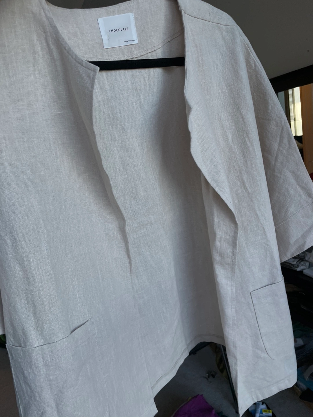 Off-white linen jacket with pockets. Short sleeves. Open front. Beige color over size look size large