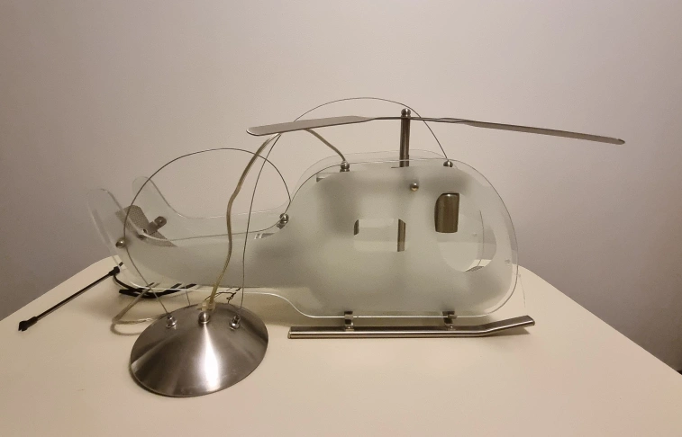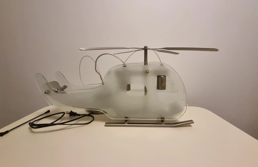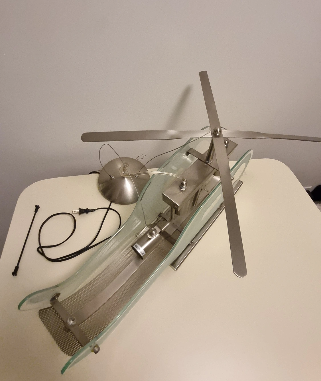 Helicopter-shaped light fixture. Glass and metal construction. Includes hanging hardware, two black wires with plugs, and a metal base.
