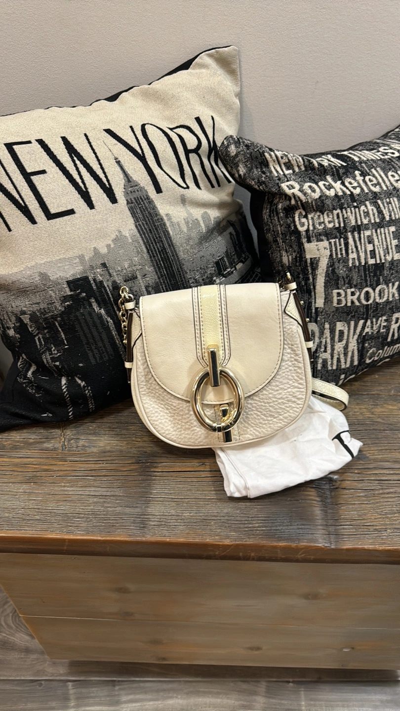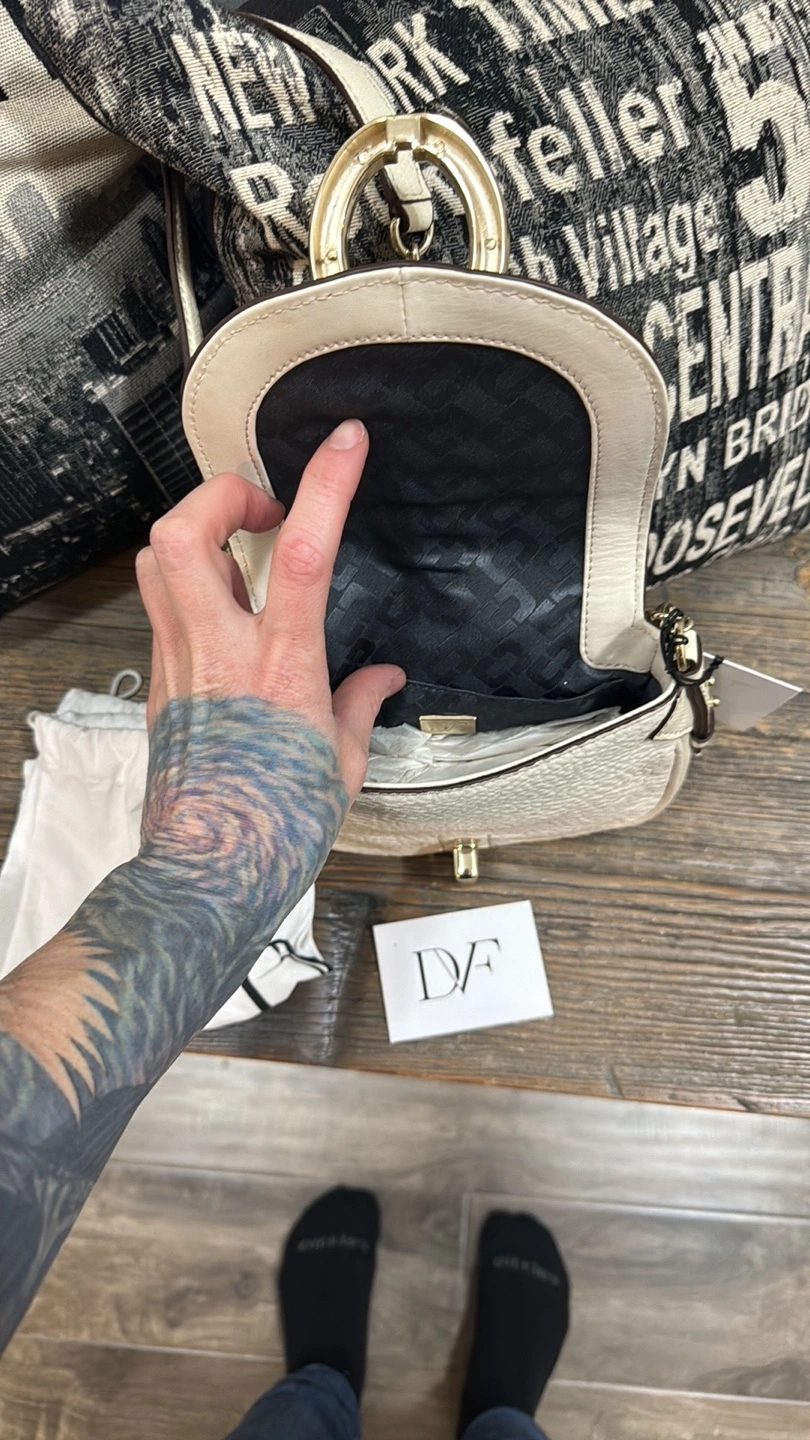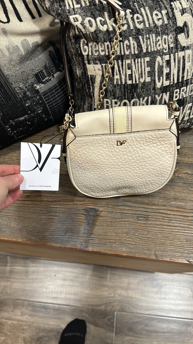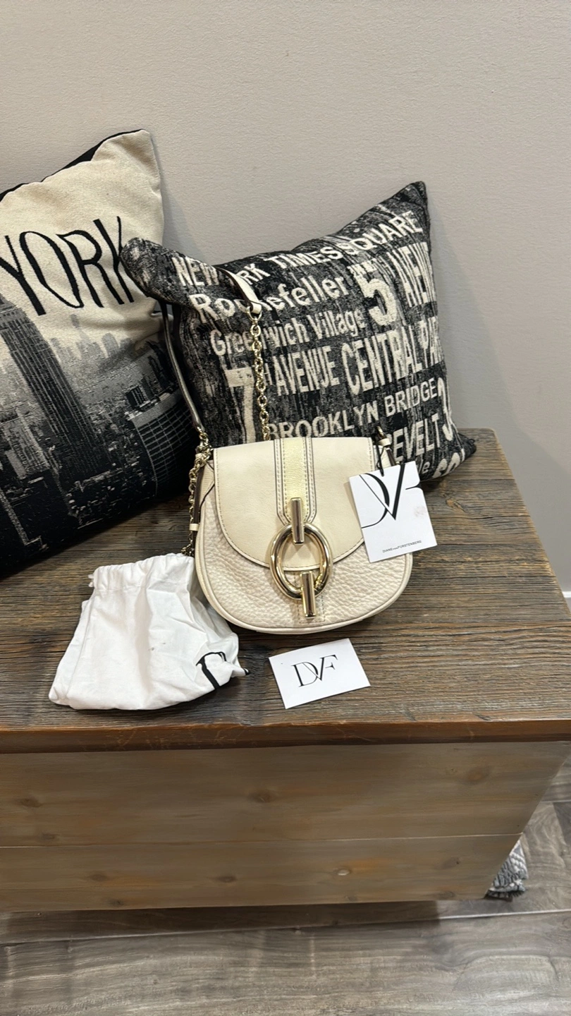 Diane von Furstenberg white/cream & gold Leather Bag NWT $185 Style: sutra New with tags, minor rubbing on leather from storage. Bought but never worn as forgot i bought it. Clasp opens to lock bag
