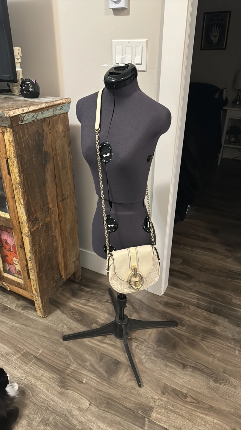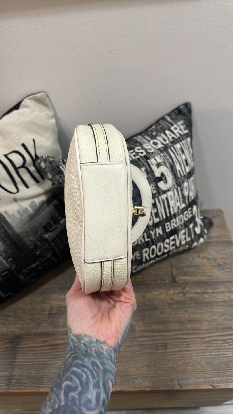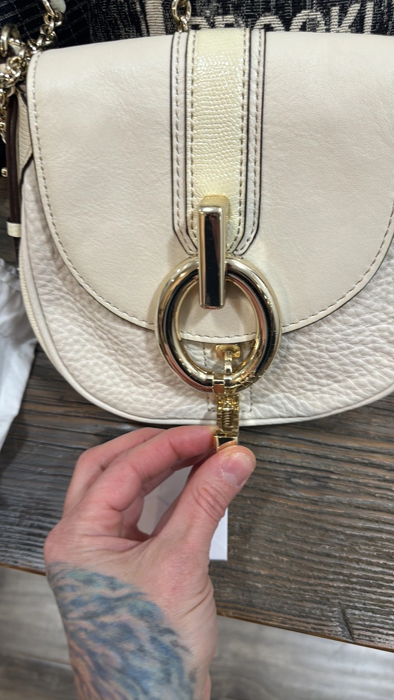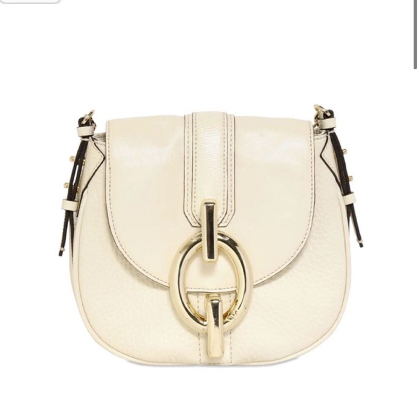 Diane von Furstenberg white/cream & gold Leather Bag NWT $185 Style: sutra New with tags, minor rubbing on leather from storage. Bought but never worn as forgot i bought it. Clasp opens to lock bag