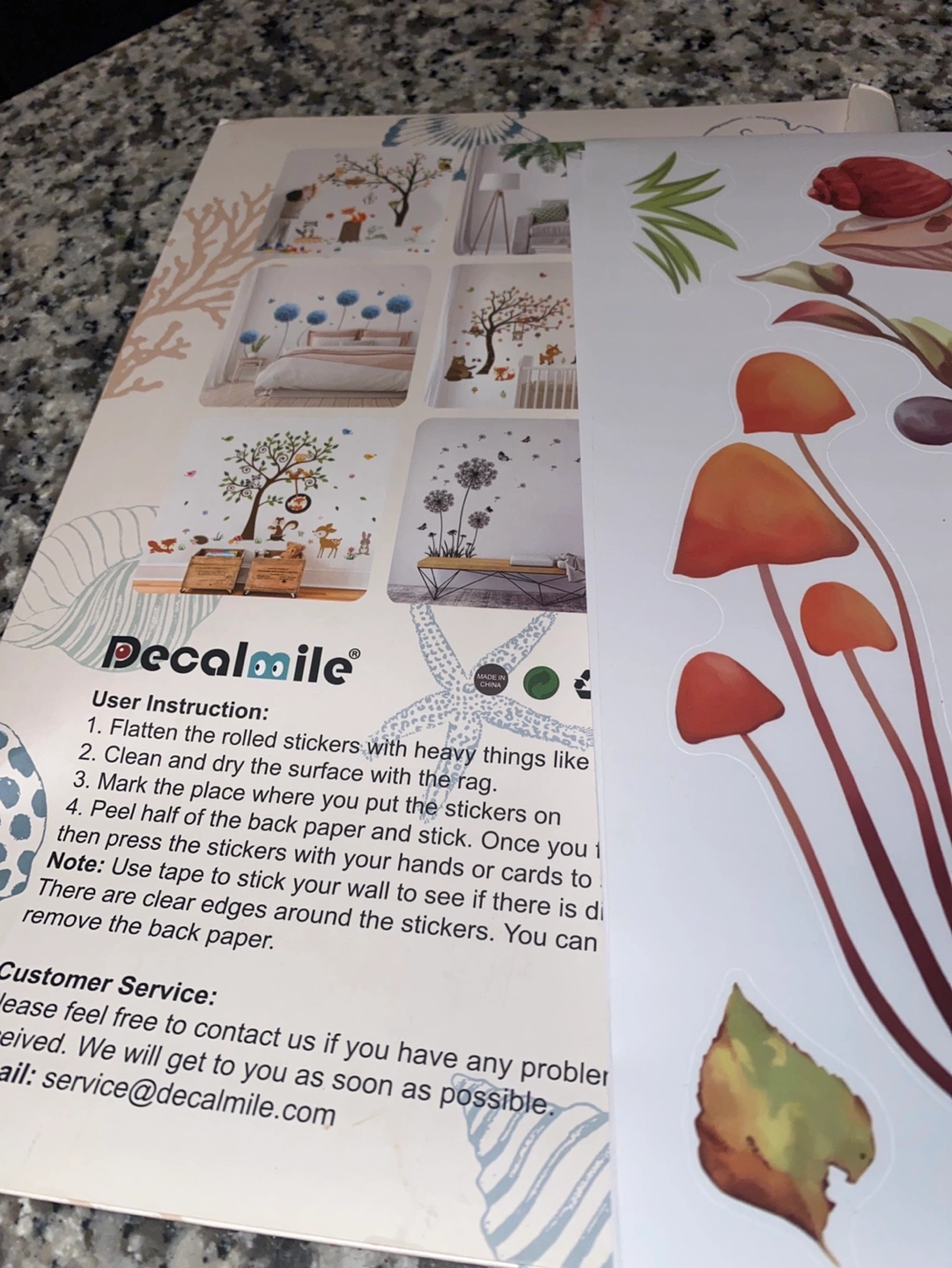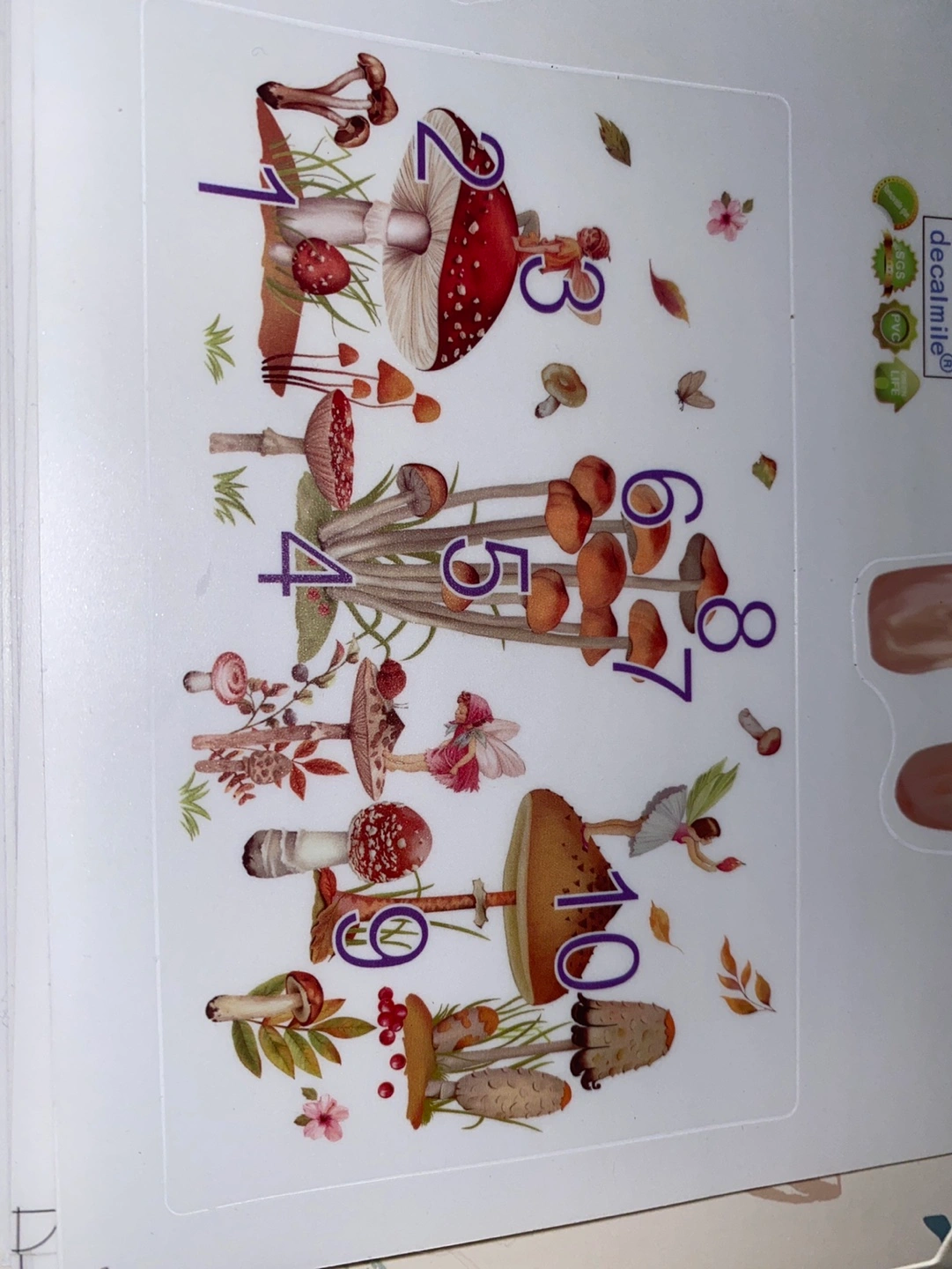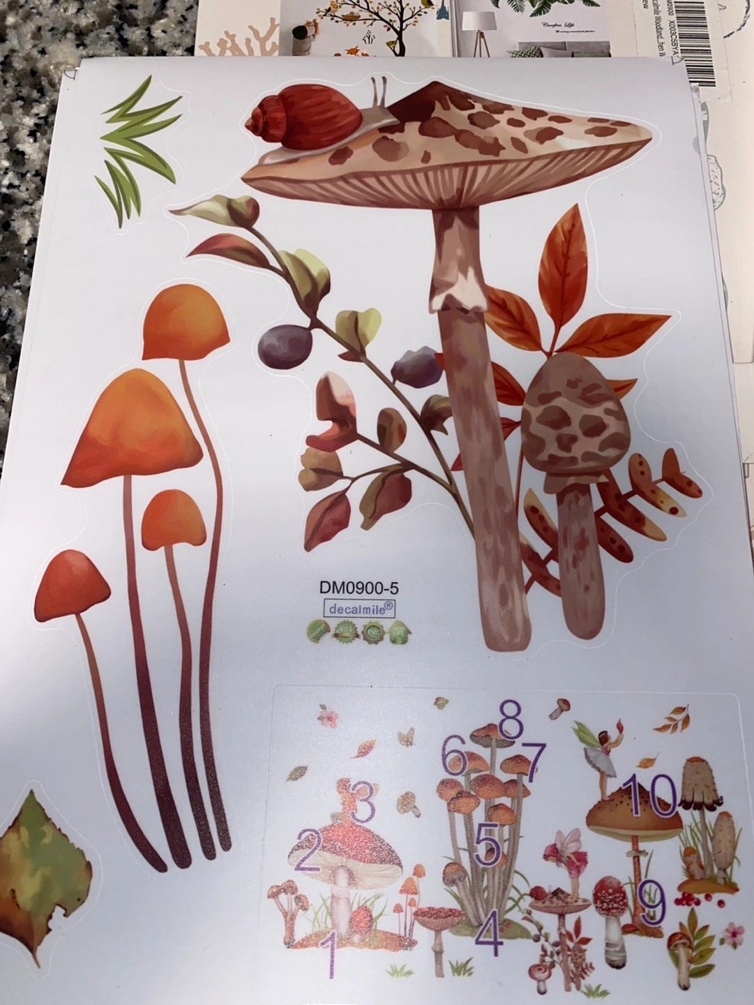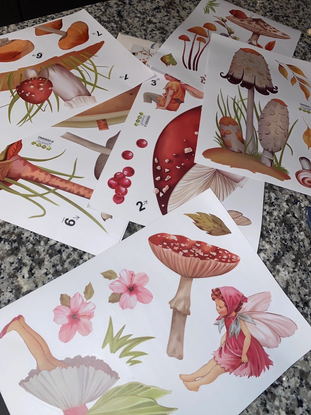Set of mushroom wall decals. Includes various sizes and styles of mushrooms, a fairy, leaves, and a snail.