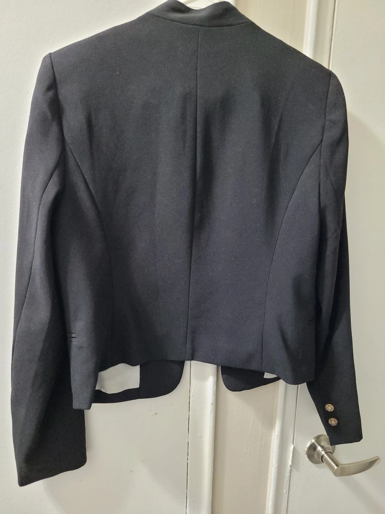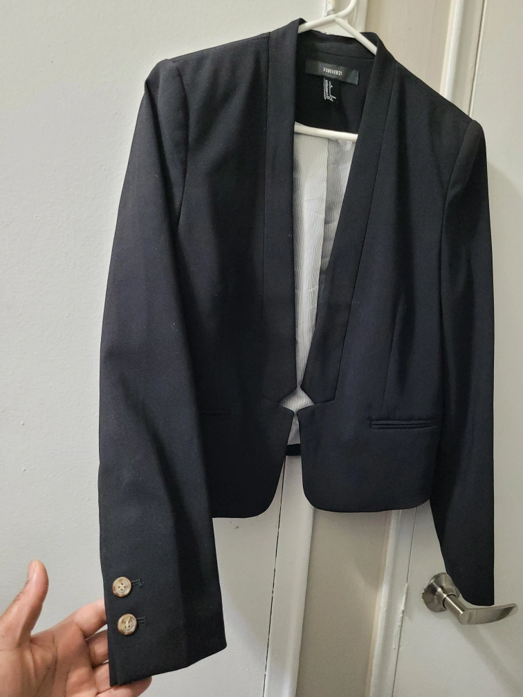 Black blazer jacket. Long sleeves. Button closure. Size L.