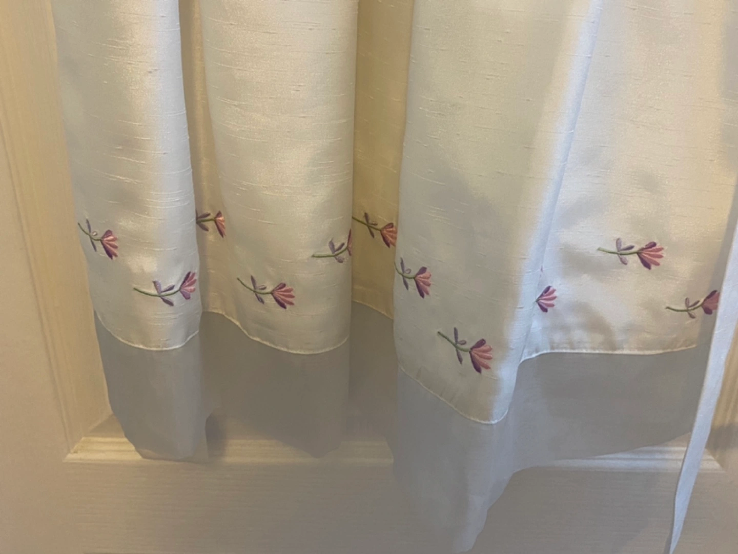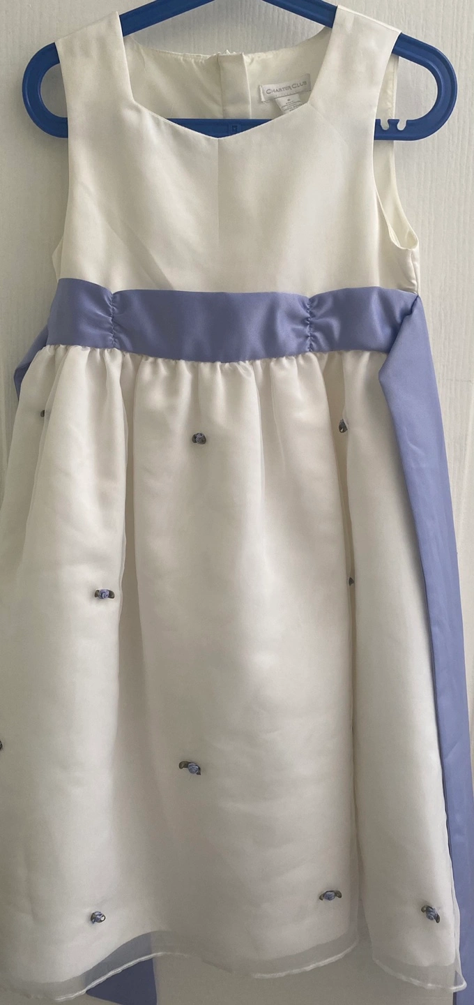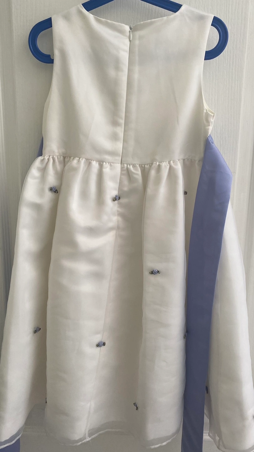 White sleeveless dress with lavender sash, embroidered flowers and a tulle overlay. Size 8. Girls