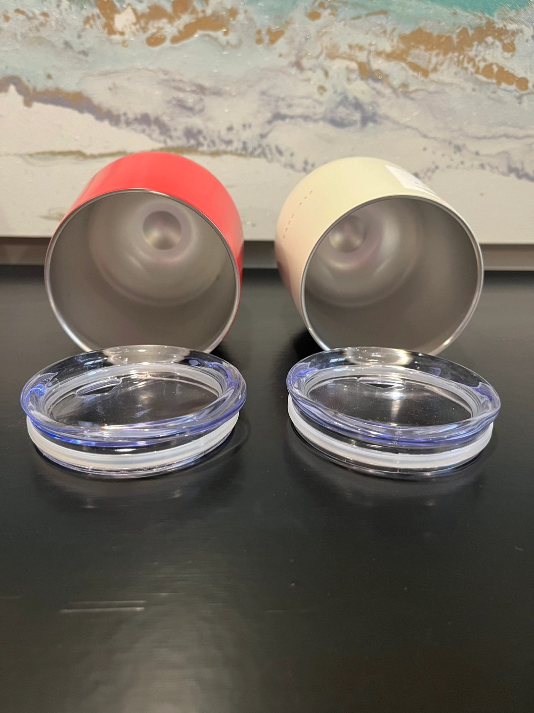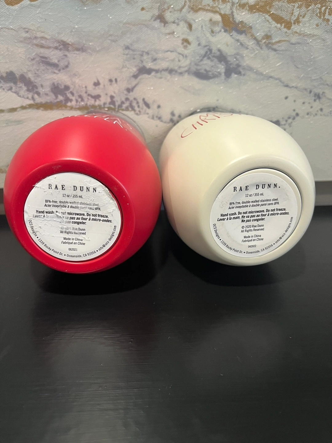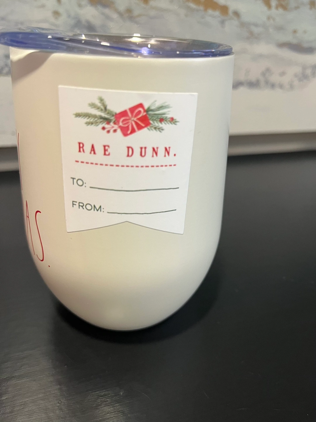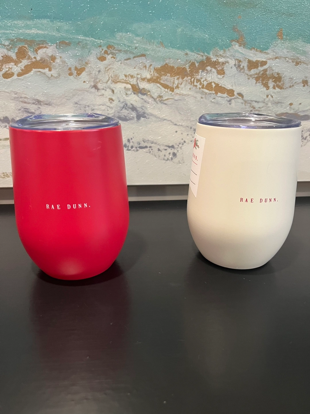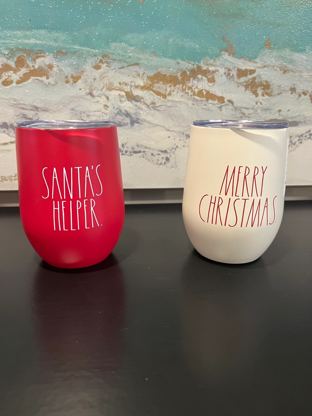 Set of two Rae Dunn Christmas tumblers. One says "Santa's Helper" and is red. The other says "Merry Christmas" and is white and is brand new. Both have lids. Pick up in Utopia