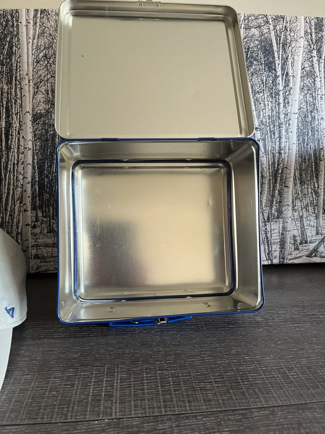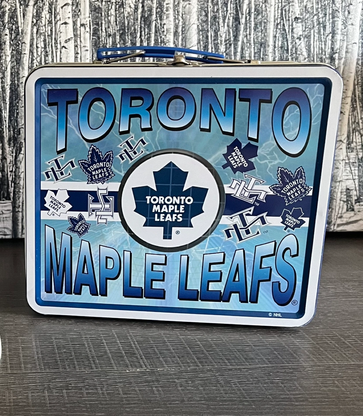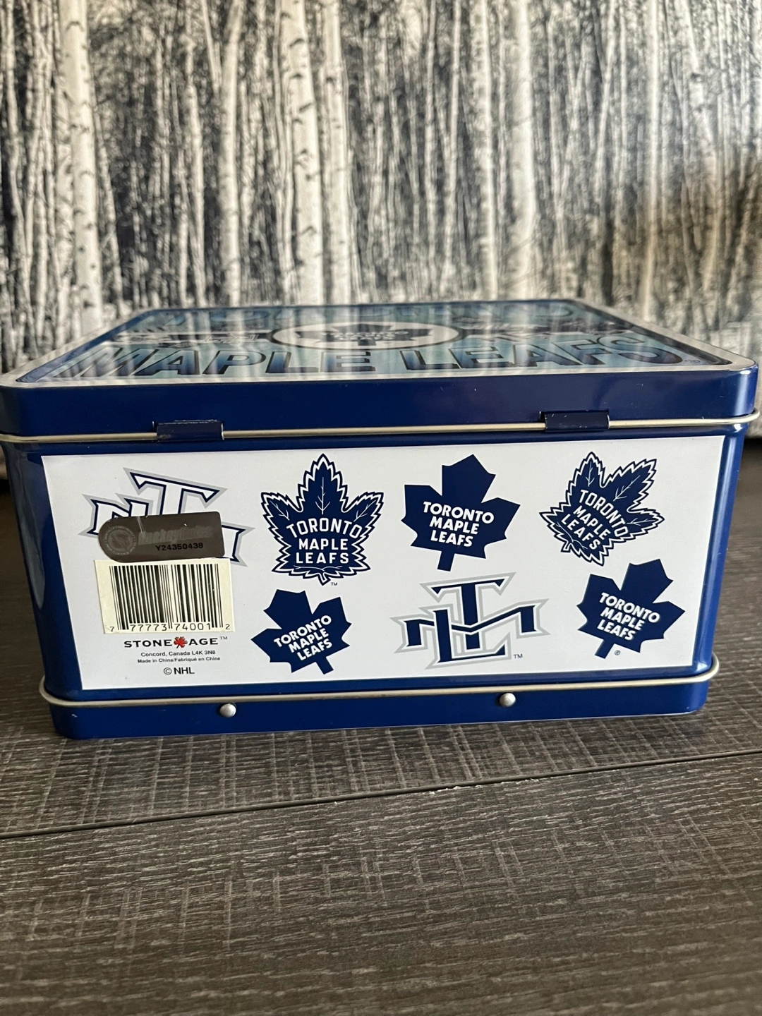 Toronto Maple Leafs tin lunch box. Blue lunch box with Toronto Maple Leafs logo. The box has a latch and a handle. It's marked "Totalement Hockey" and "NHL". Great for any Leafs fan. Pick up in Utopia