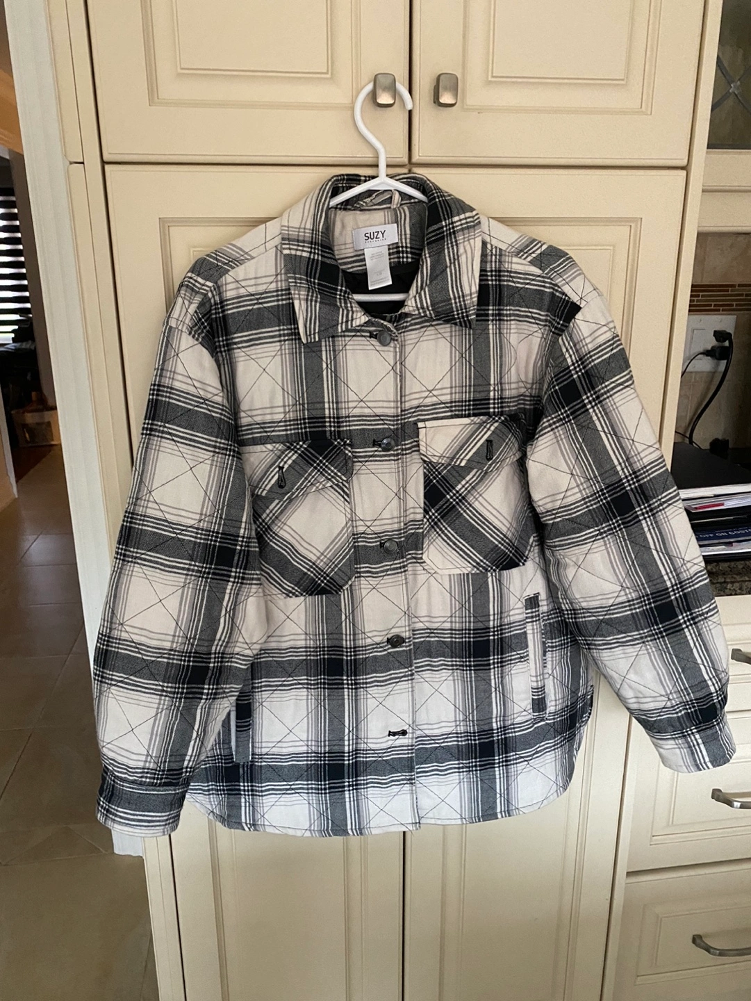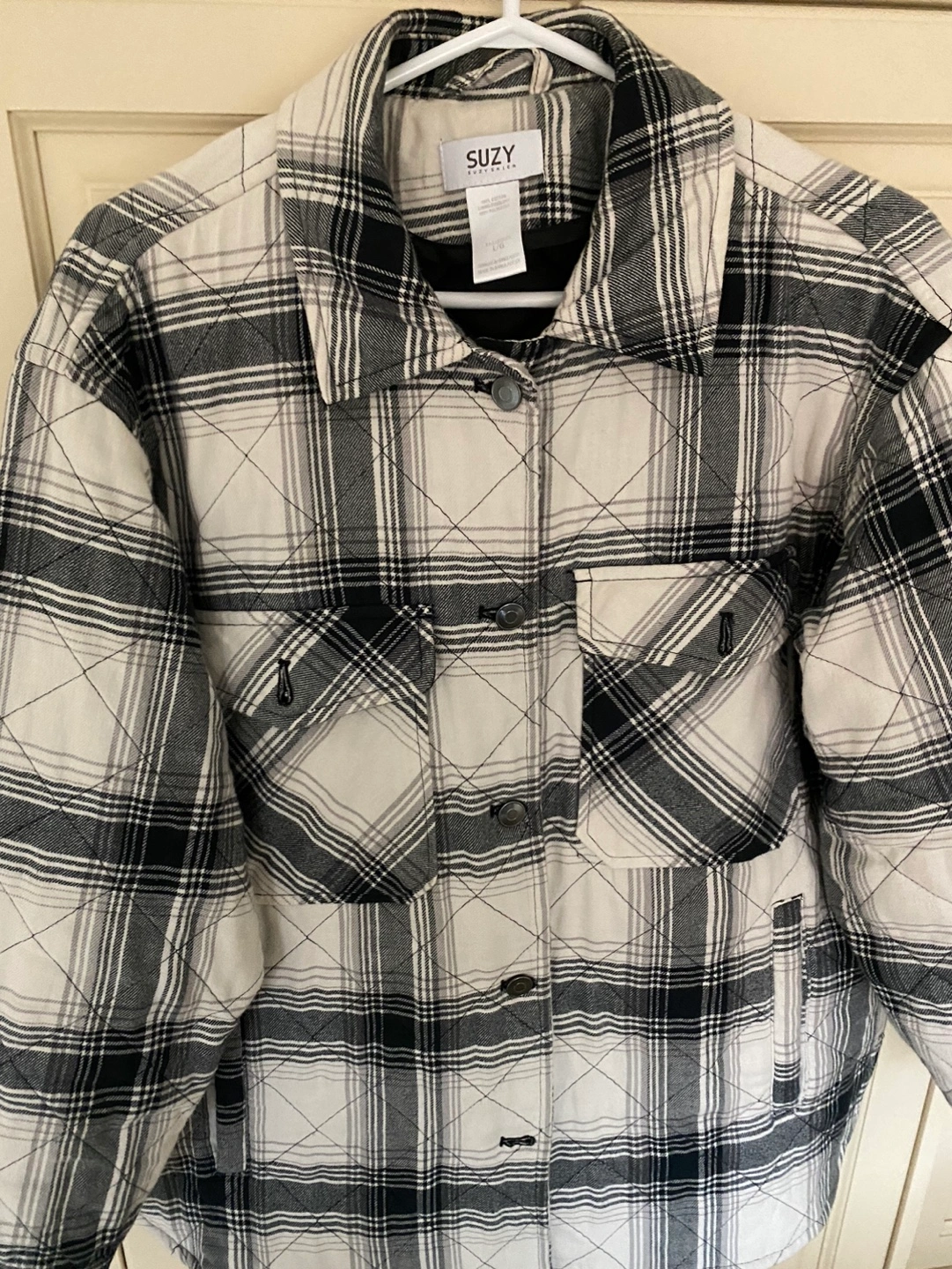 Black and white jacket with a quilted lining. Long sleeves and button closure. Only worn a couple of times and had it professionally cleaned. Size is Large
