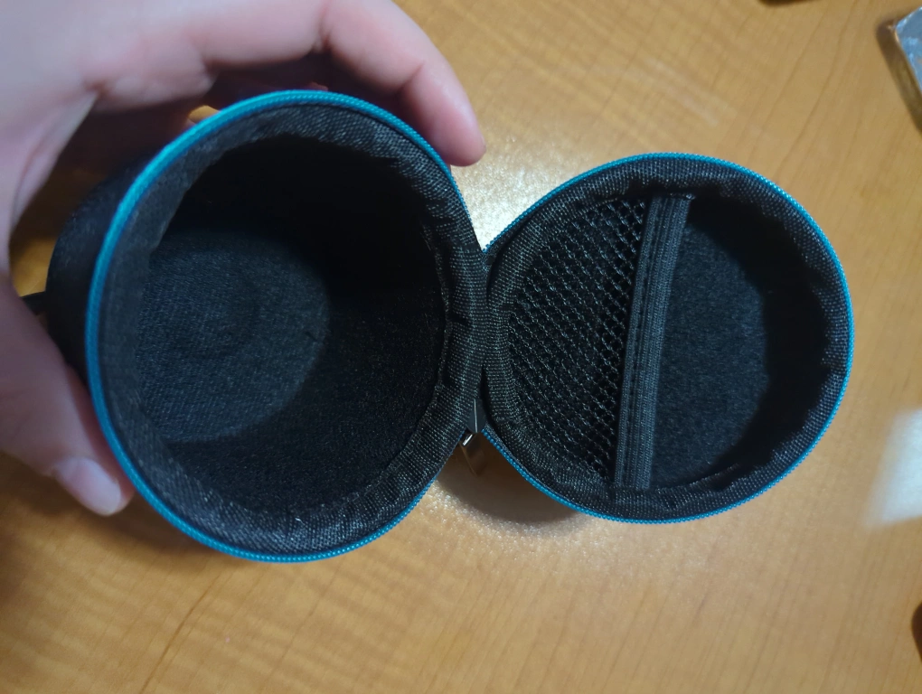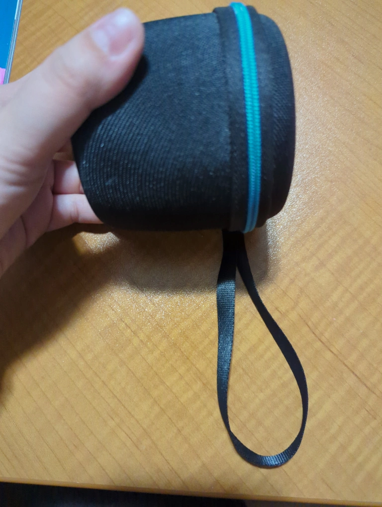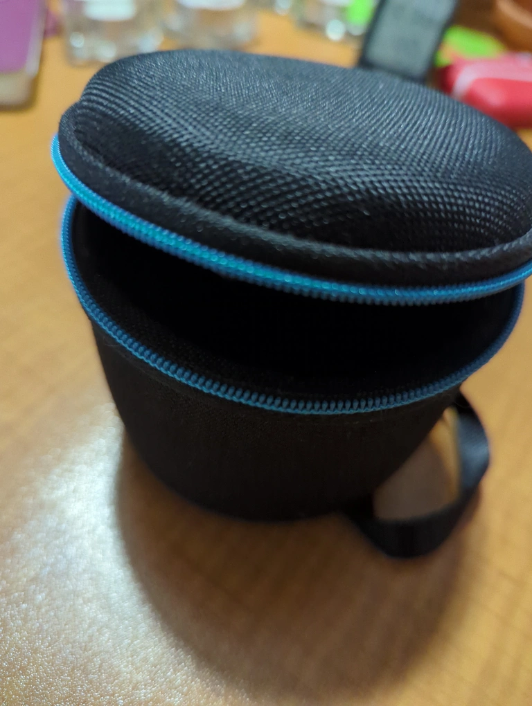 Black carrying case with a zipper. It has a blue zipper trim and a small handle. Has a small mesh pocket inside. The case measures about 3 1/2 inches in diameter. pick up Etobicoke alternative pick up: Union Stations @ Sephora