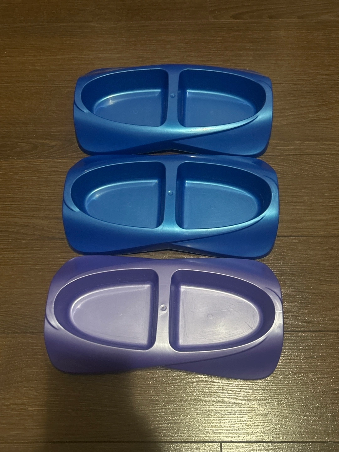 Set of three double dog or cat bowls. Two blue and one purple. Perfect for feeding two pets at once. $1 for all 3