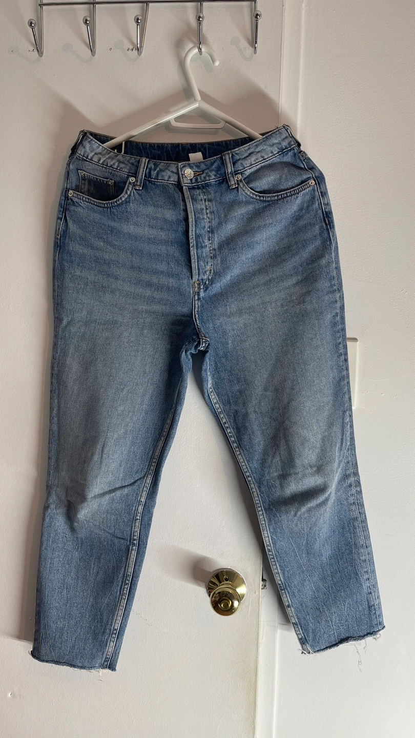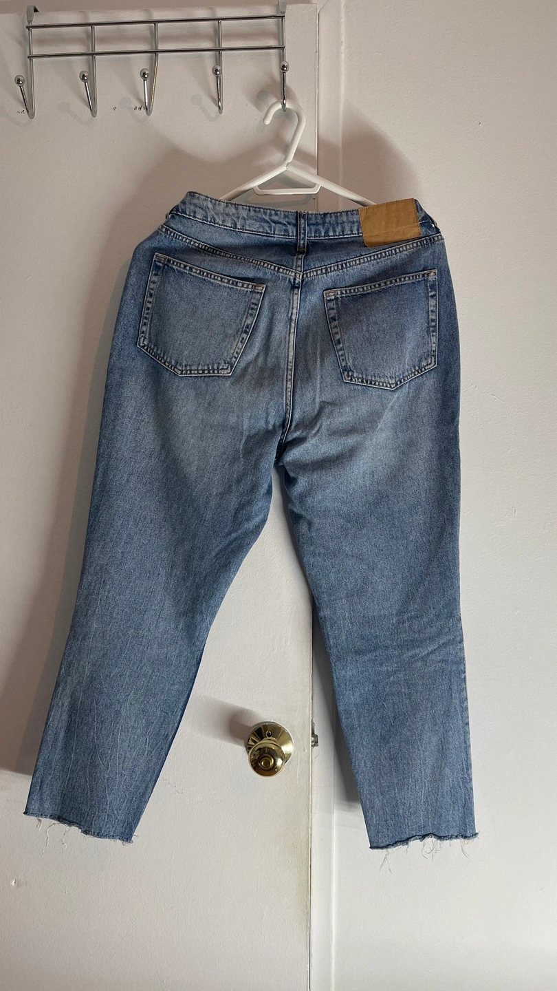 Dividend Light wash denim jeans with a high waist and frayed hem. Size 10