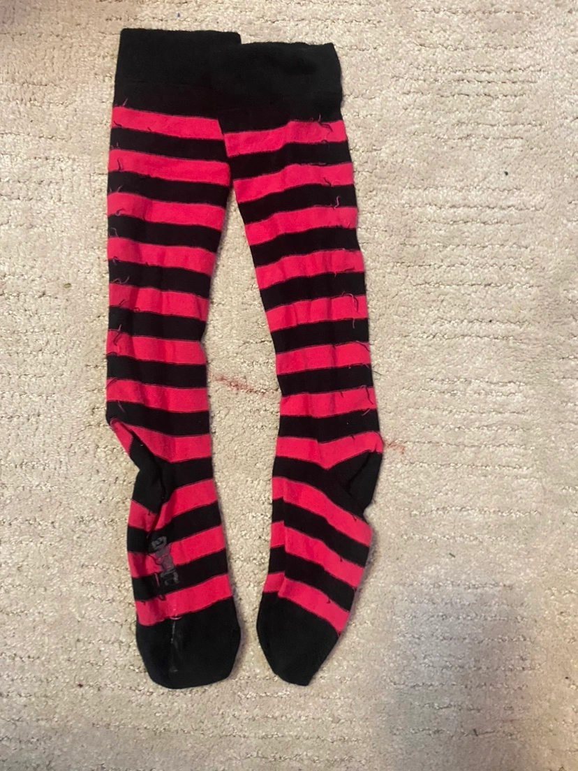 Striped thigh high socks with black and pink stripes. Bought on Amazon for 20