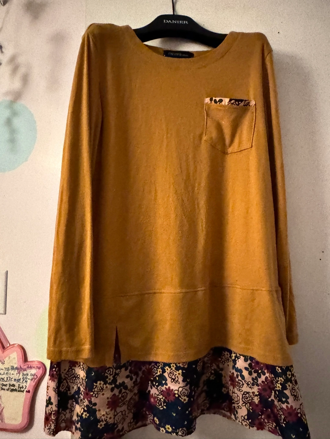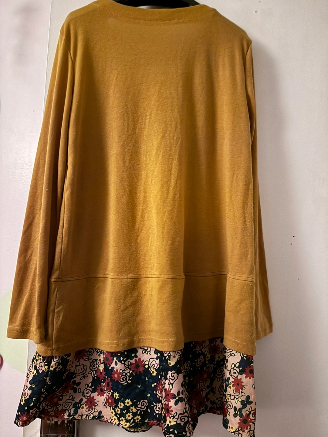Long-sleeved top with a floral bottom. Mustard yellow colour. Has a pocket on the left side.