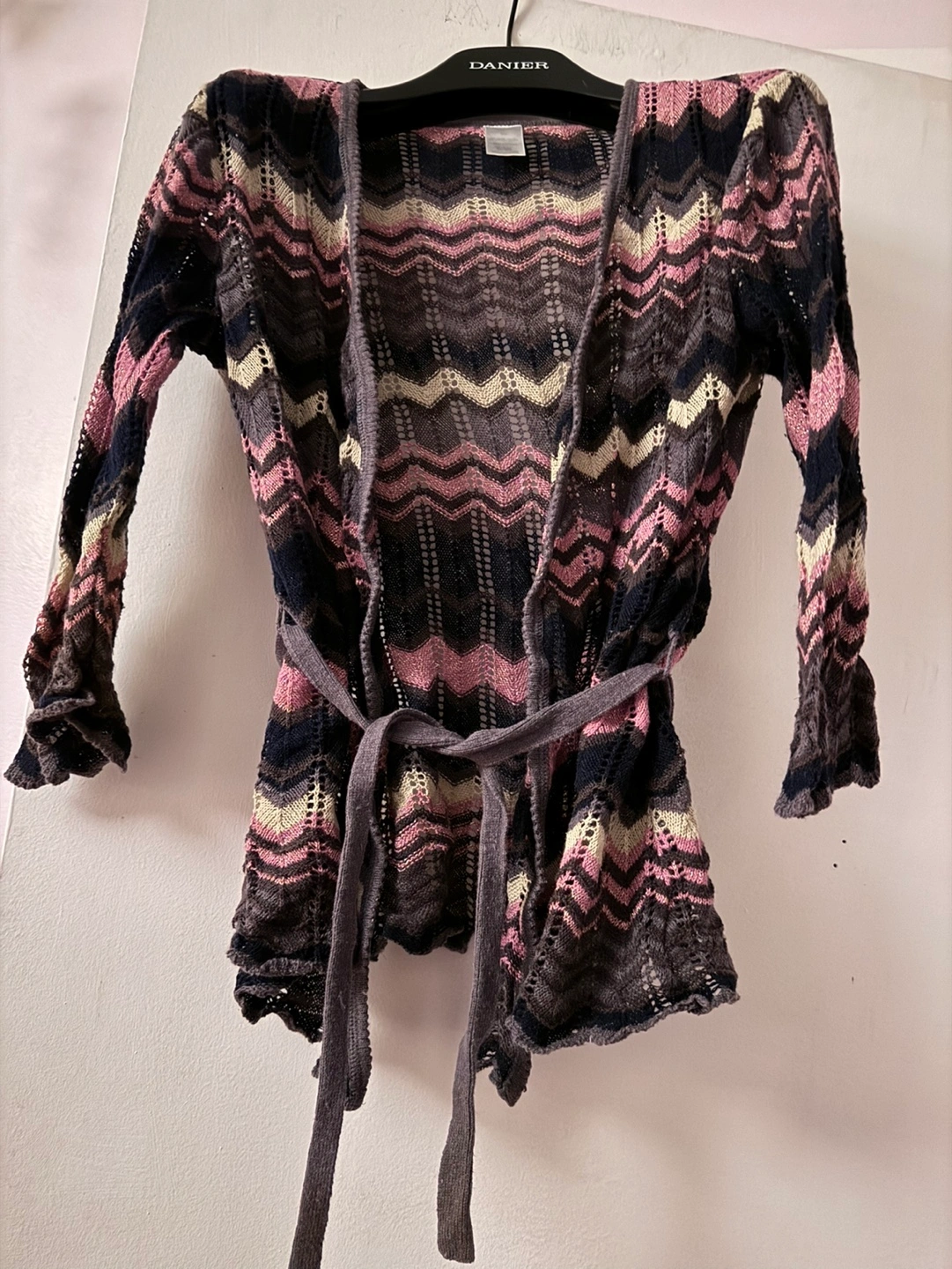 Striped cardigan with a belt. Three-quarter sleeves. Open front.