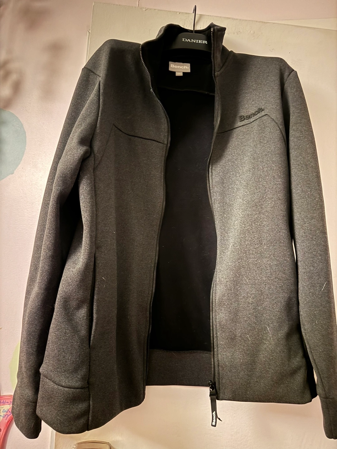 Grey fleece jacket with black zipper and black lining. Full zipper closure with two pockets.