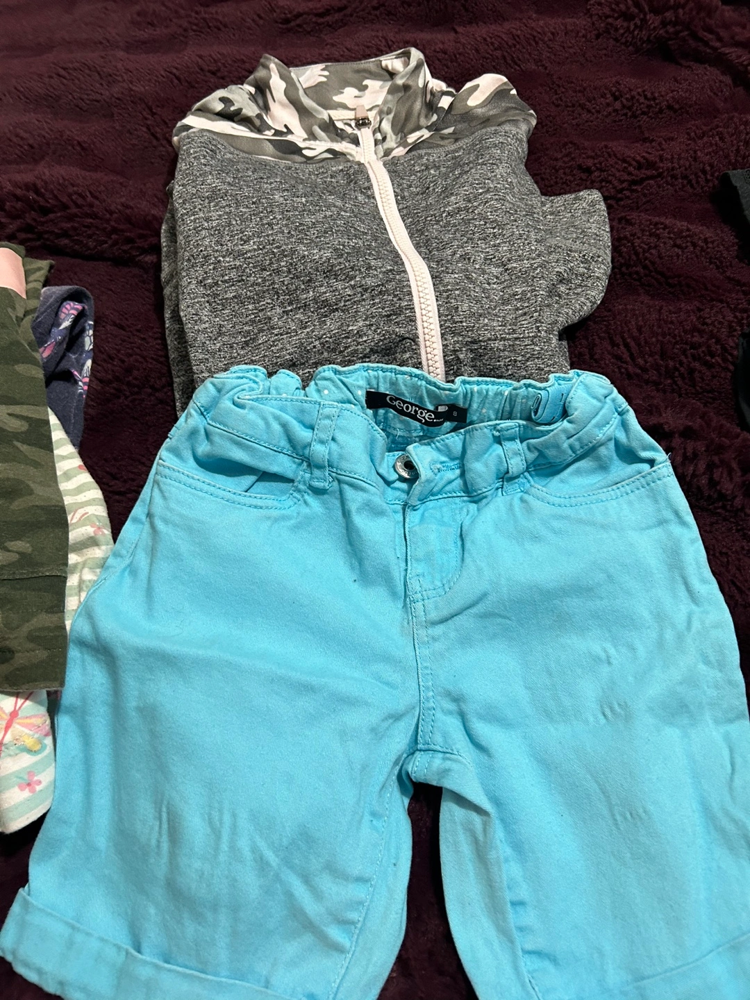 Blue shorts, zip fly, cuffed hems, size 9. Track jacket
