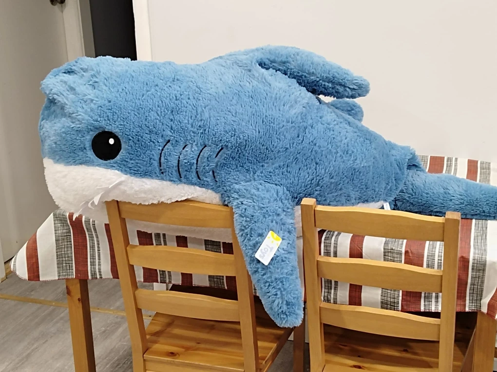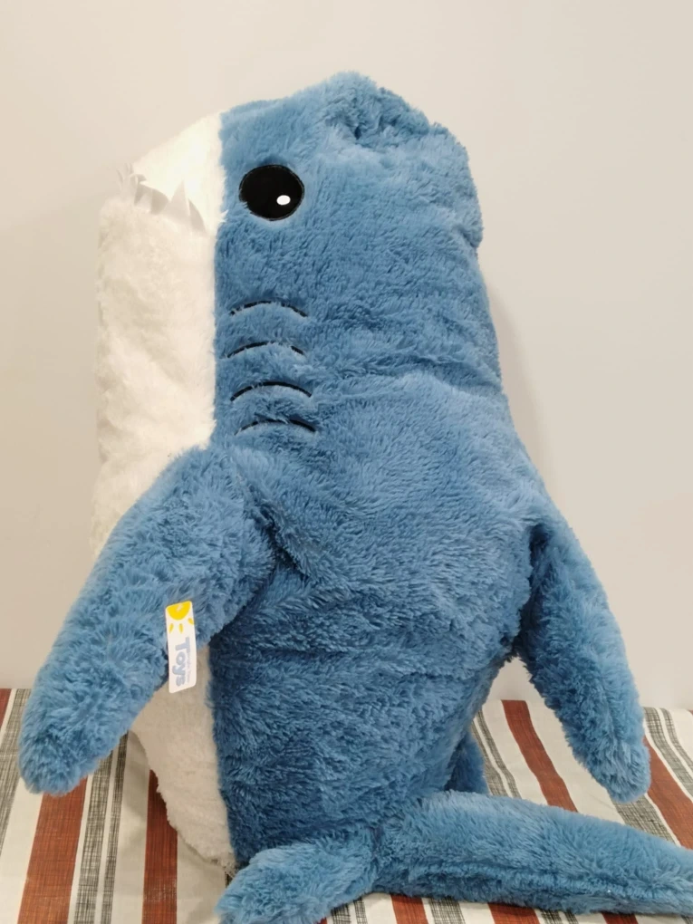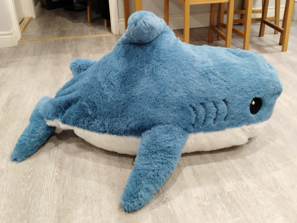 Large blue and white plush shark. Soft and cuddly. Great for cuddling or as a decorative piece.