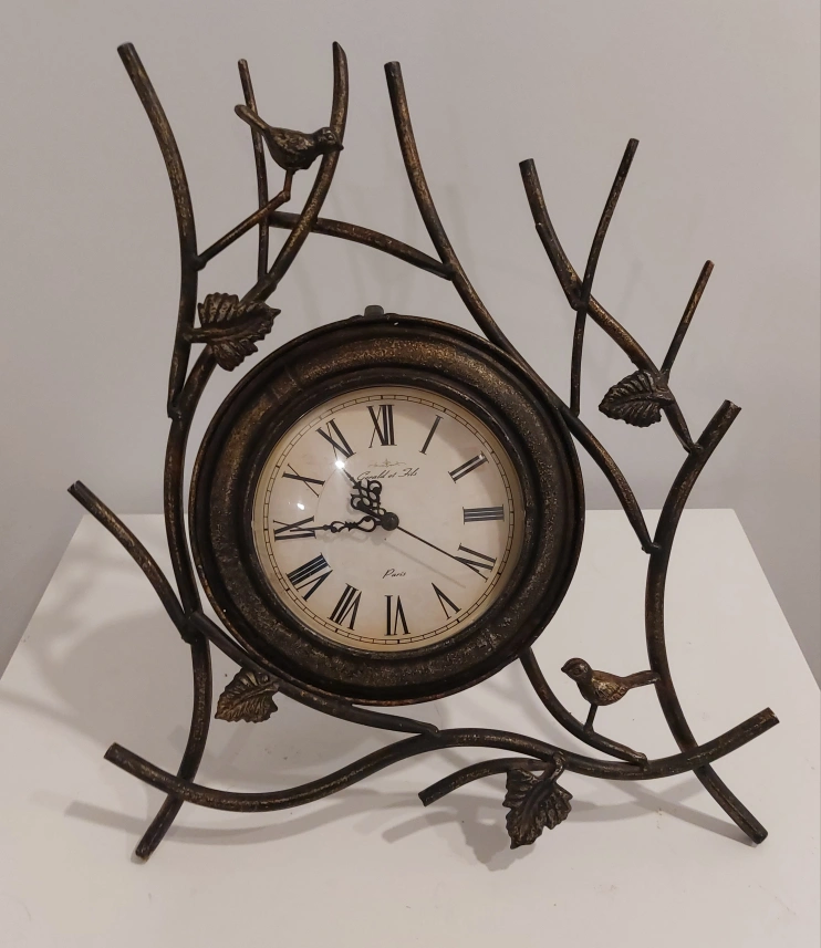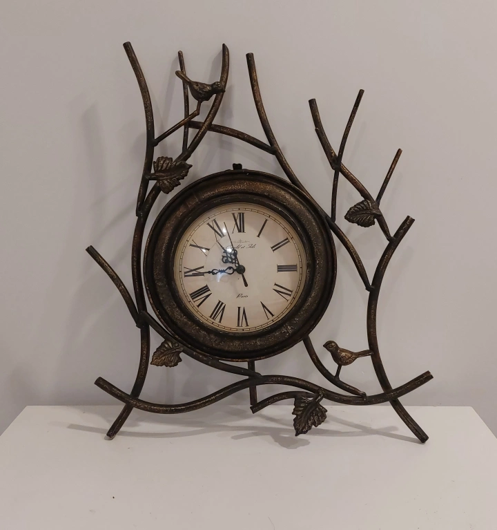 Metal clock with bird and branch design. Features a stand. It's in great condition .