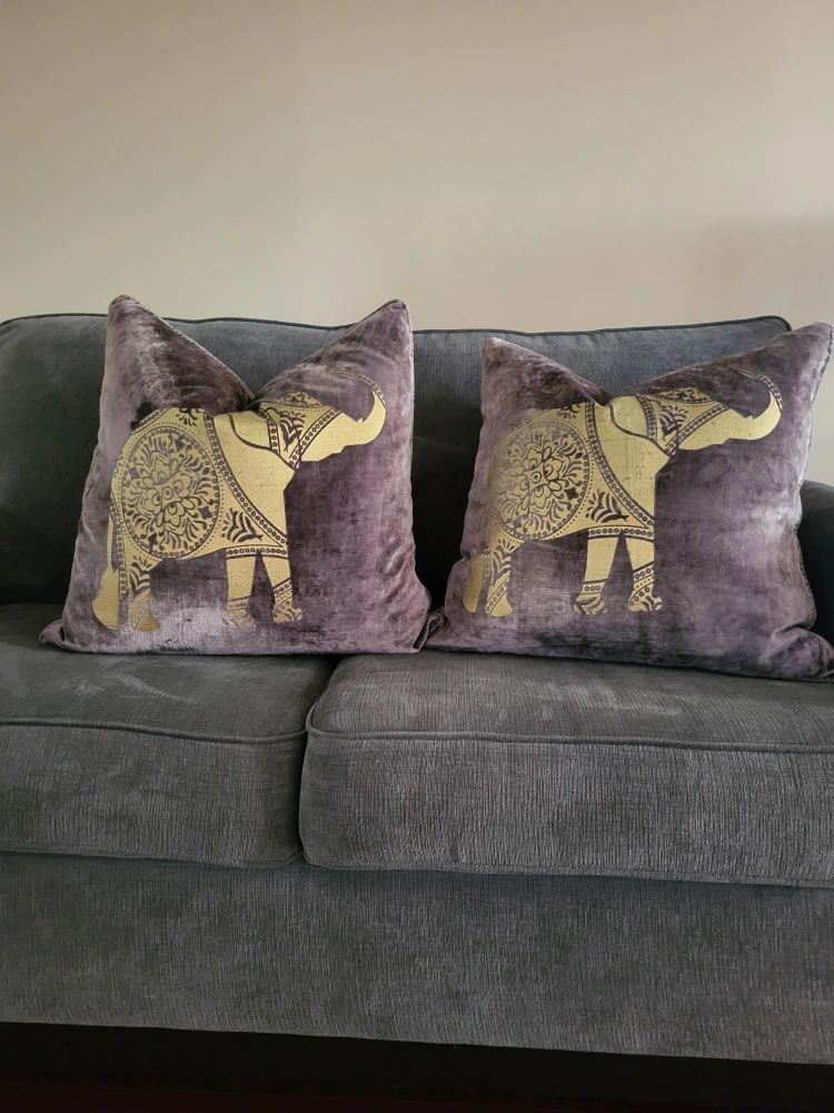 Two decorative throw pillows with gold elephant design. Purple velvet fabric.