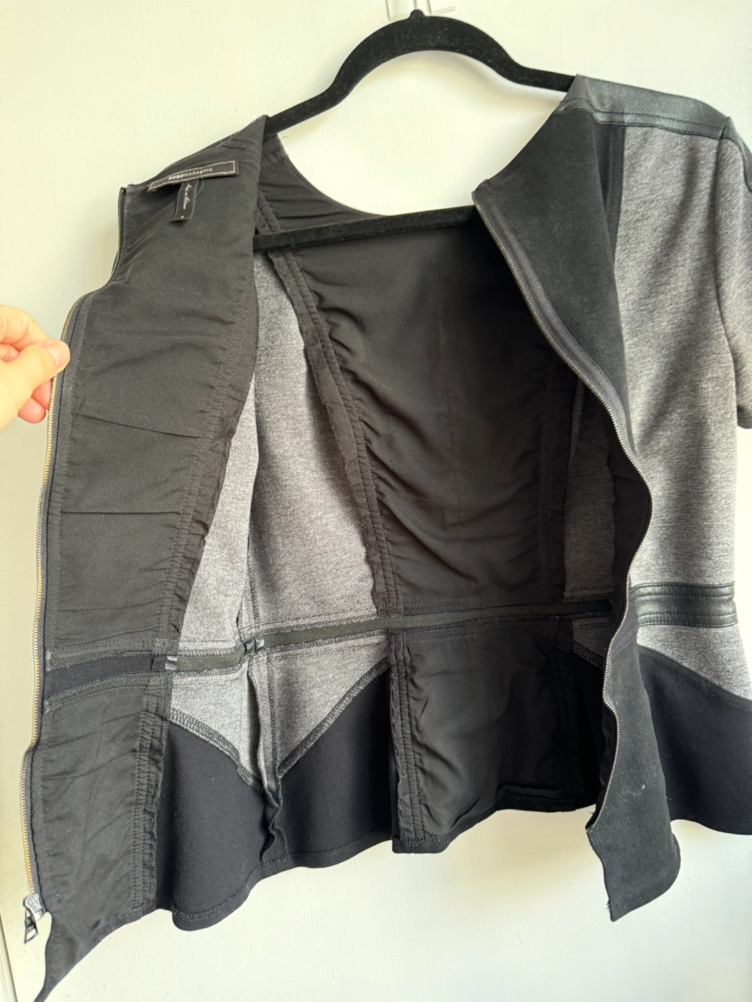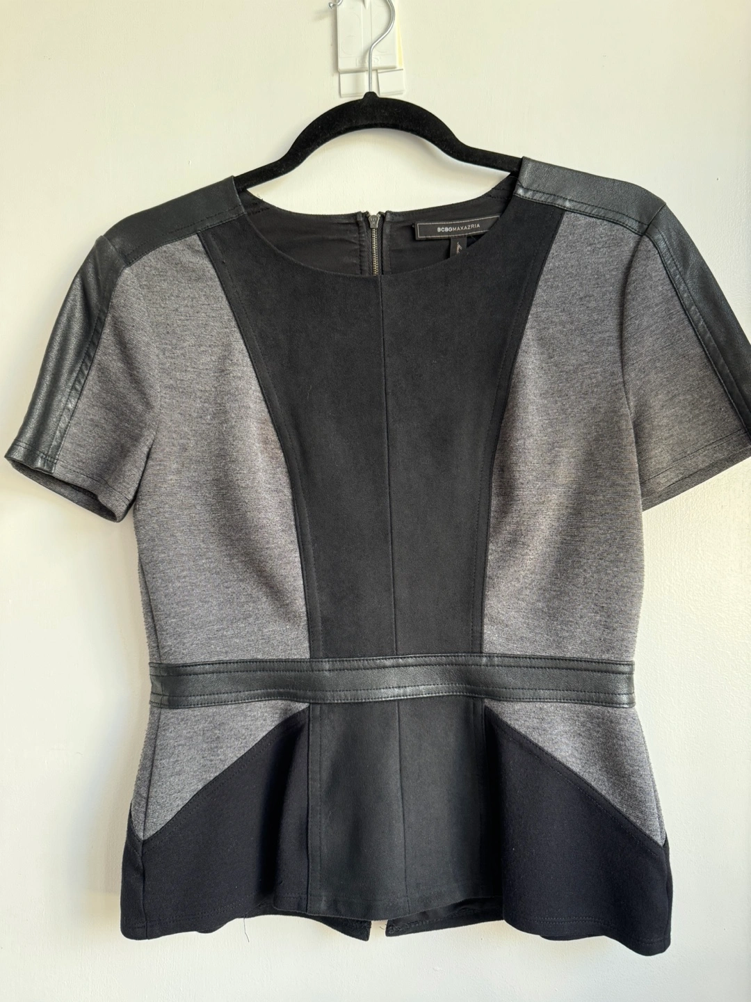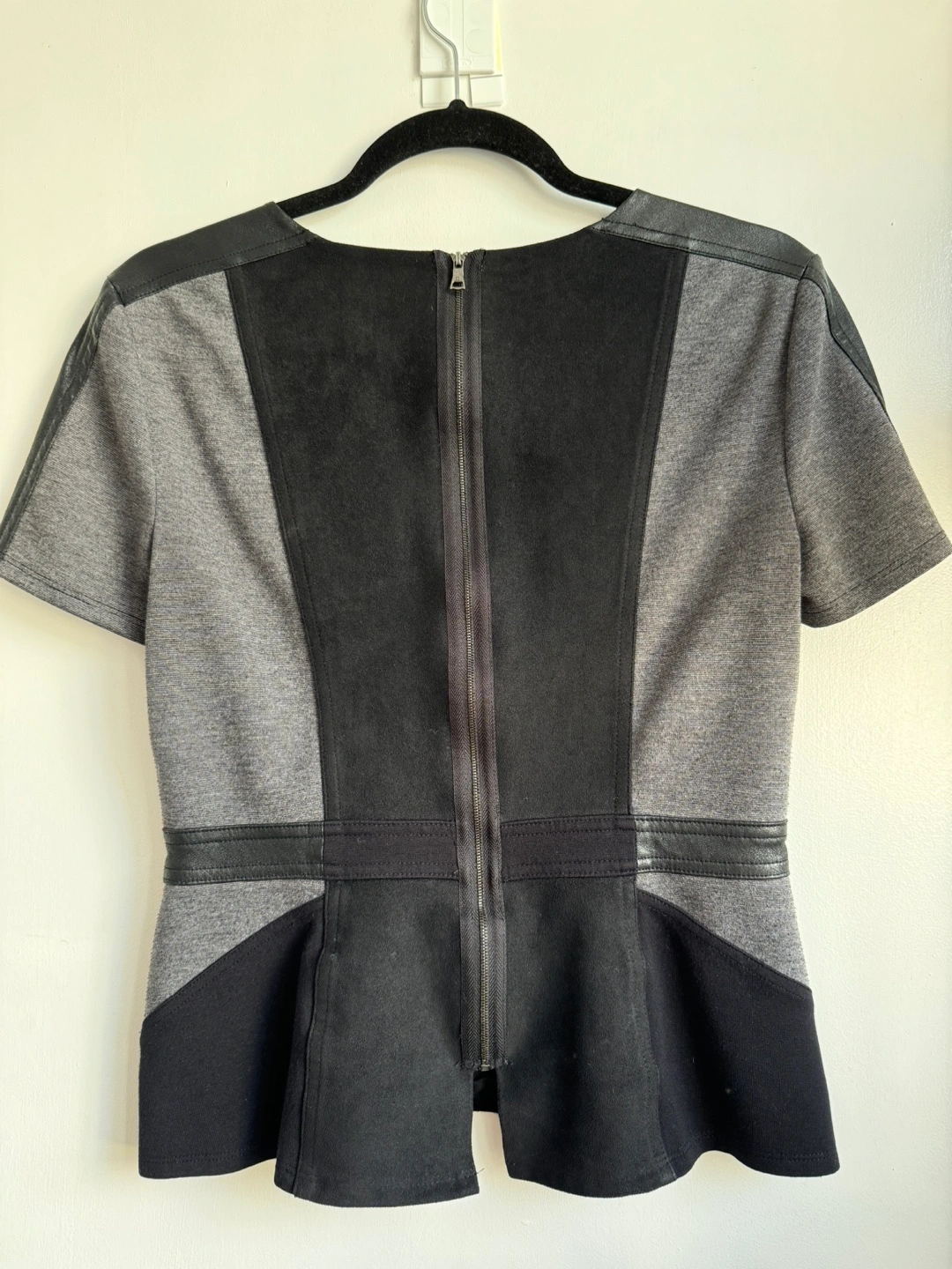 Short-sleeved top with black and grey fabric and vegan leather details. The grey material is stretchy. Back zipper closure. Fitted style. Timeless and classic style