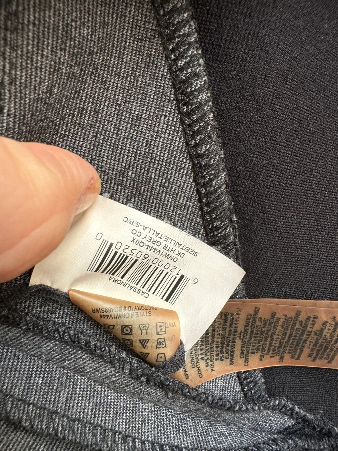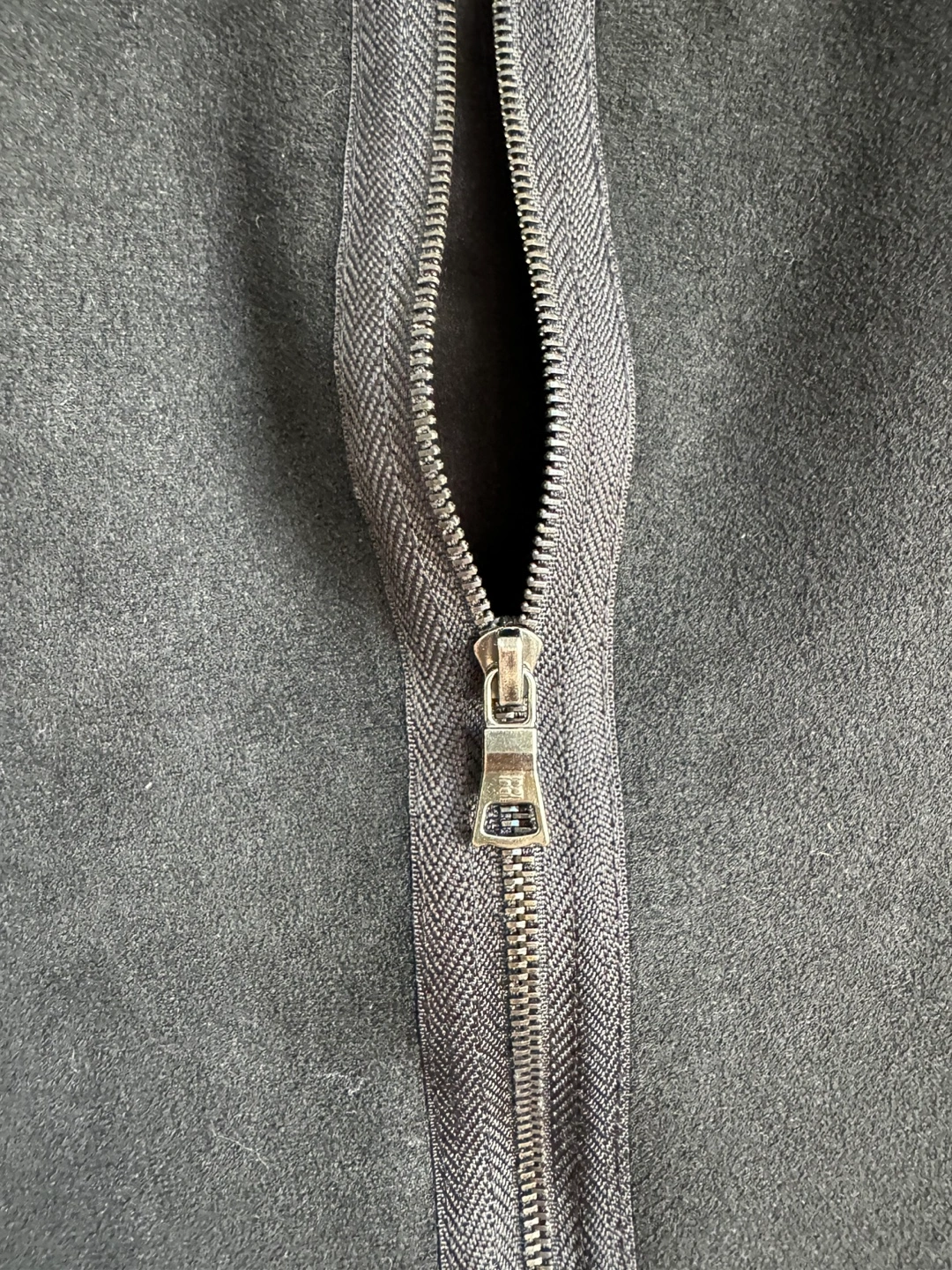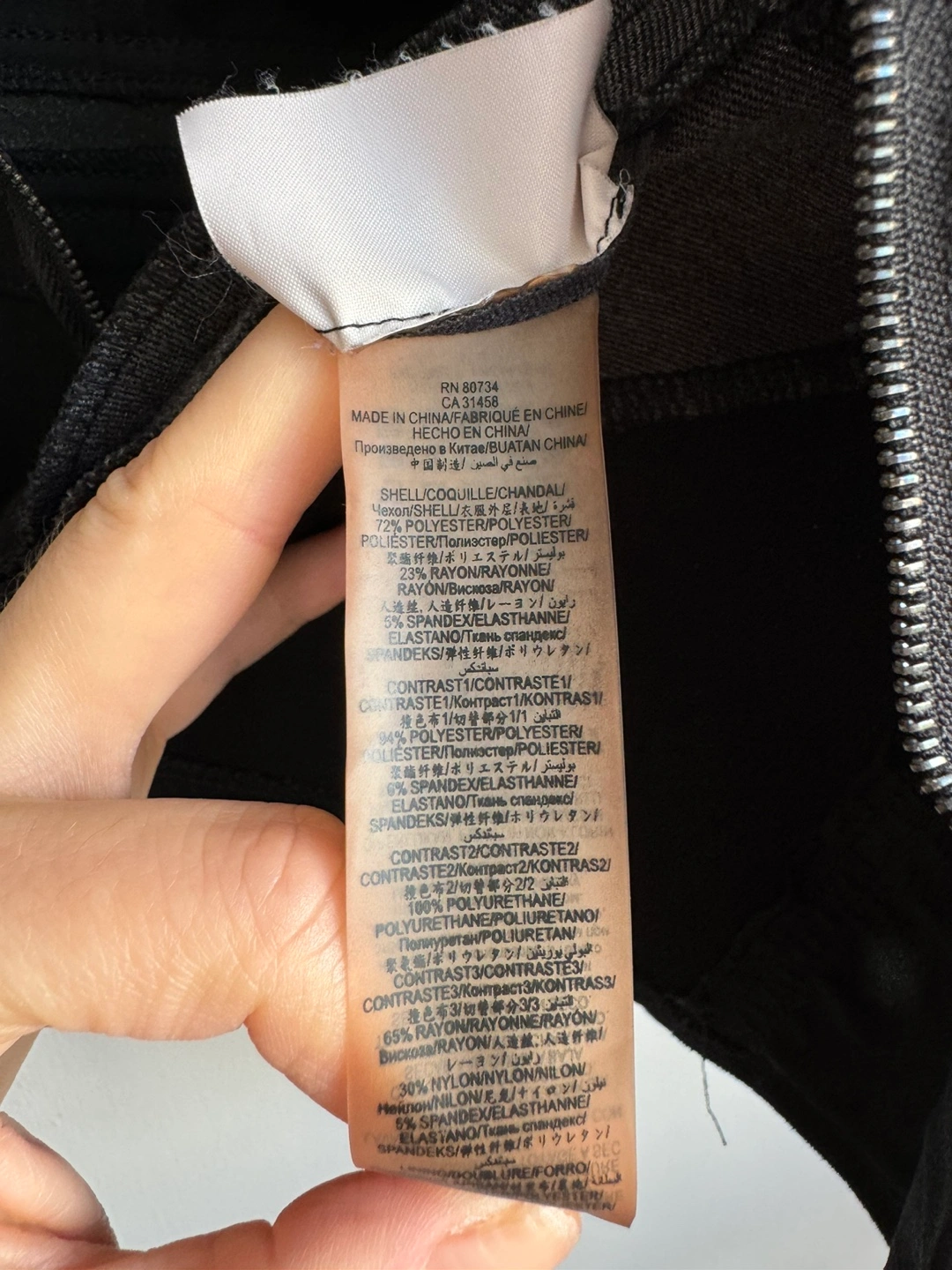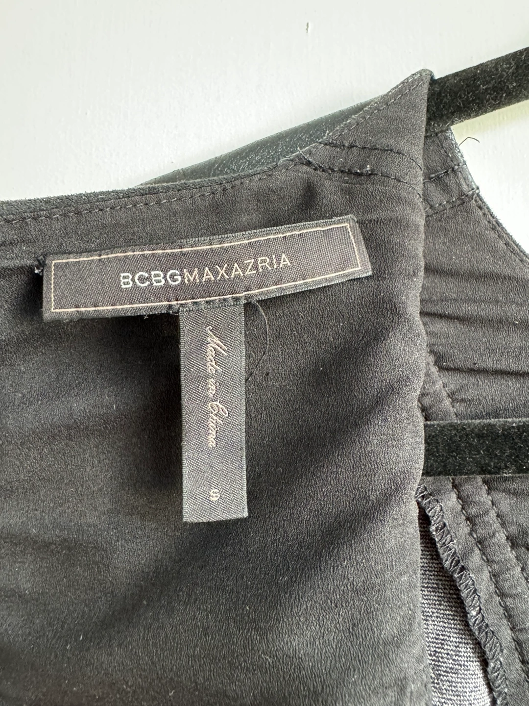 Short-sleeved top with black and grey fabric and vegan leather details. The grey material is stretchy. Back zipper closure. Fitted style. Timeless and classic style