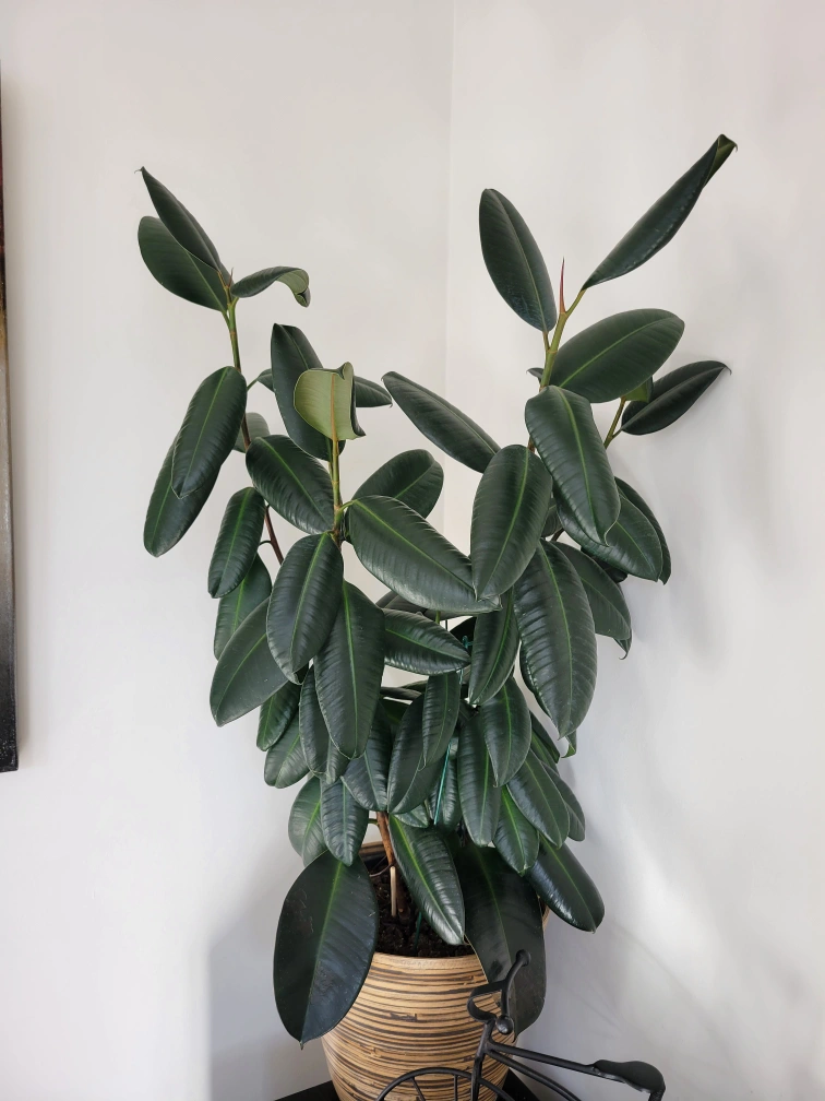 Large rubber plant. Healthy with lots of leaves. Does not include pot. is in a plastic pot which is inside.