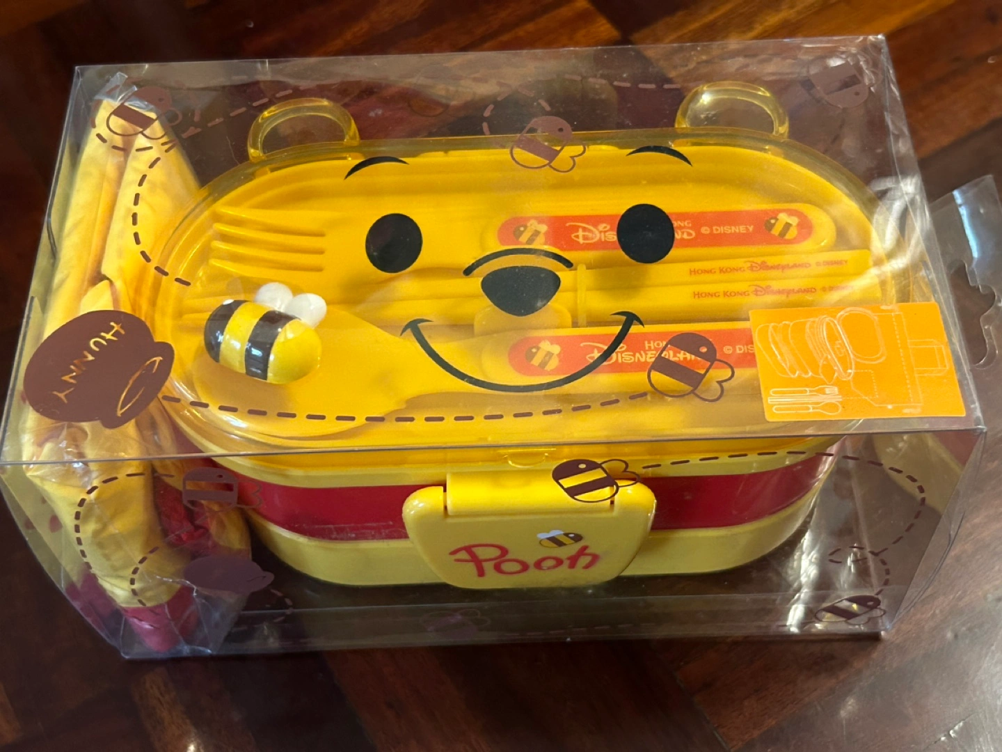 Yellow and red lunch box with Winnie the Pooh design. Includes cutlery. Comes with a small bag.
