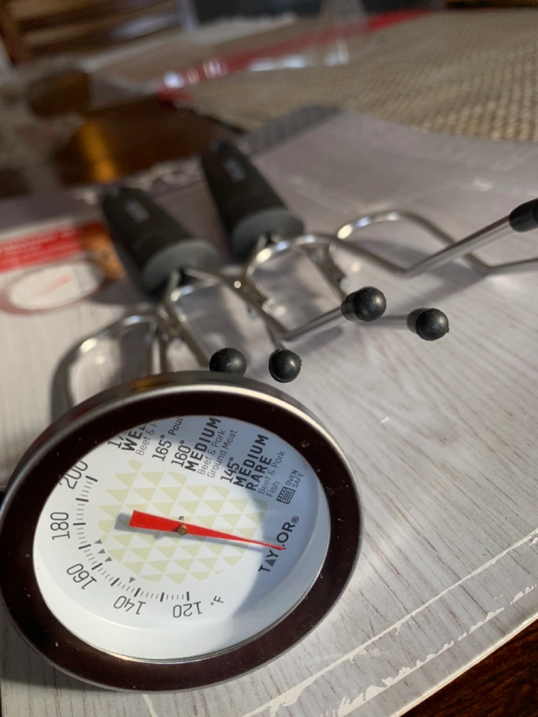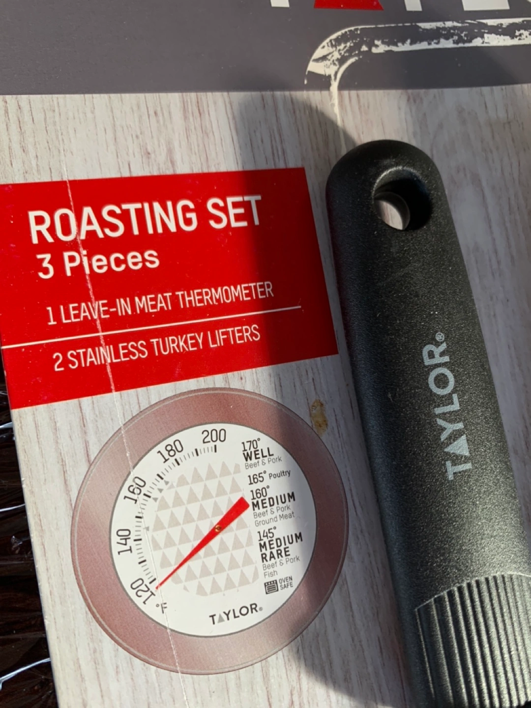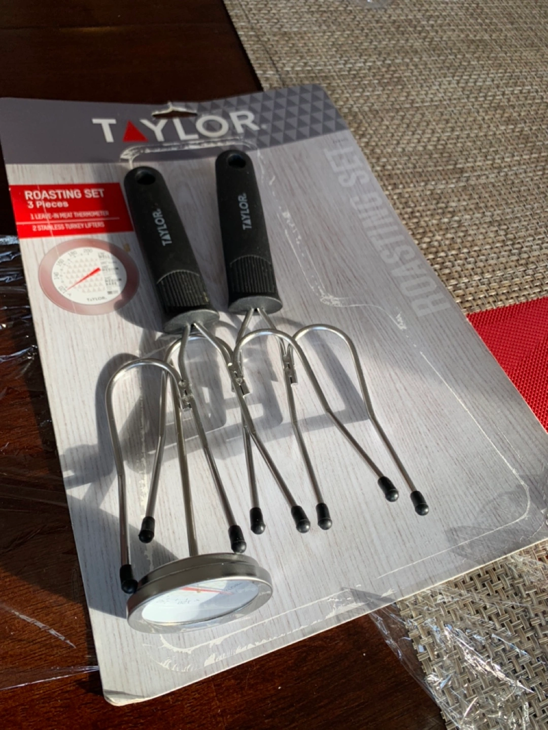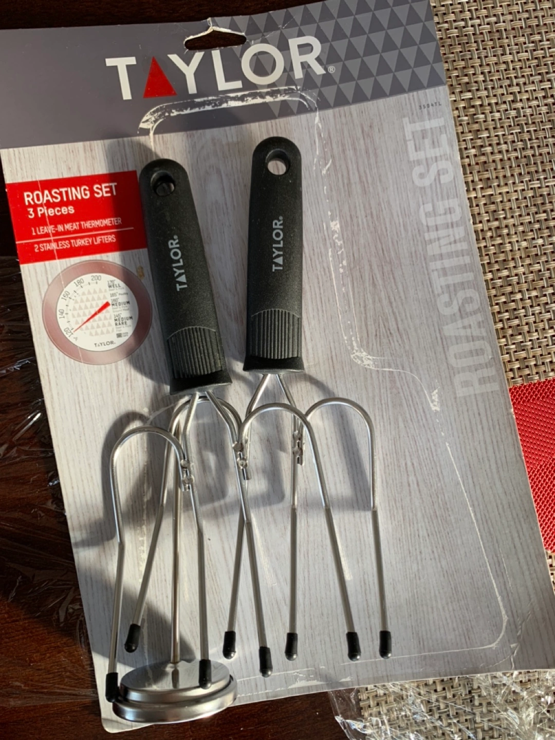 Roasting set includes one leave-in meat thermometer and two stainless turkey lifters. Pick up in new Westminster very close to sky train station. Cash preferred Can deliver downtown along expo line station at arranged time