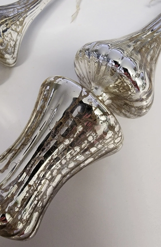 BRAND NEW CONDITION WITH TAGS Set of 2 Retails for $37.99 + tax Color is a mercury silver with a slight golden hue Set of 2 antiqued silver ornaments. Ornaments are approximately 9.5 inches tall by 3 inches width at largest point. These gorgeous ornaments are made of glass with mercury detailing and have a textured, shiny finish. Christmas Tree Ornaments / Holiday Season Decor Anthropologie dupe