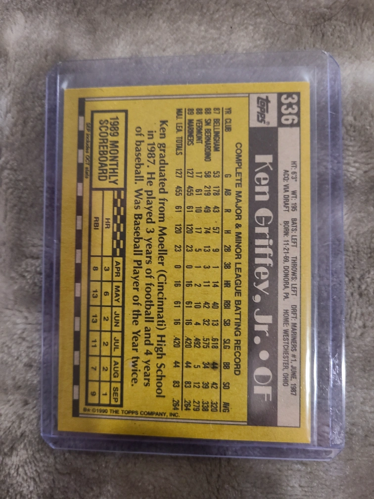 Ken Griffey Jr. Topps baseball card from 1990The card is in mint condition.
