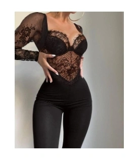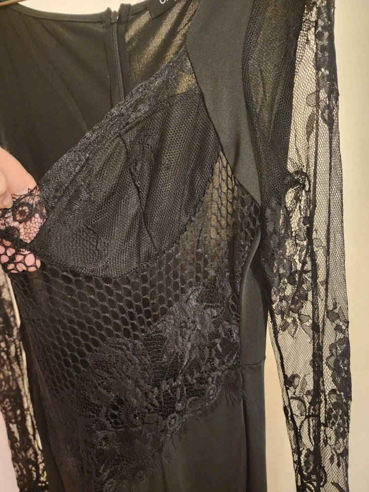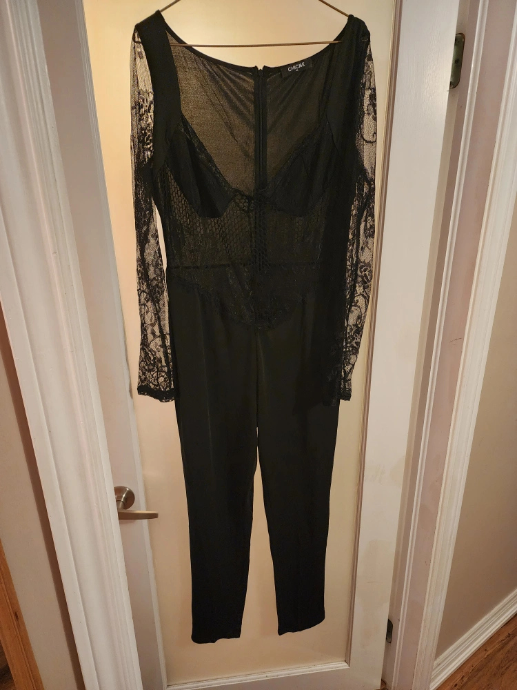 never work black jumpsuit. stretch with lace arm and bodice detail. paid $30 , asking $20