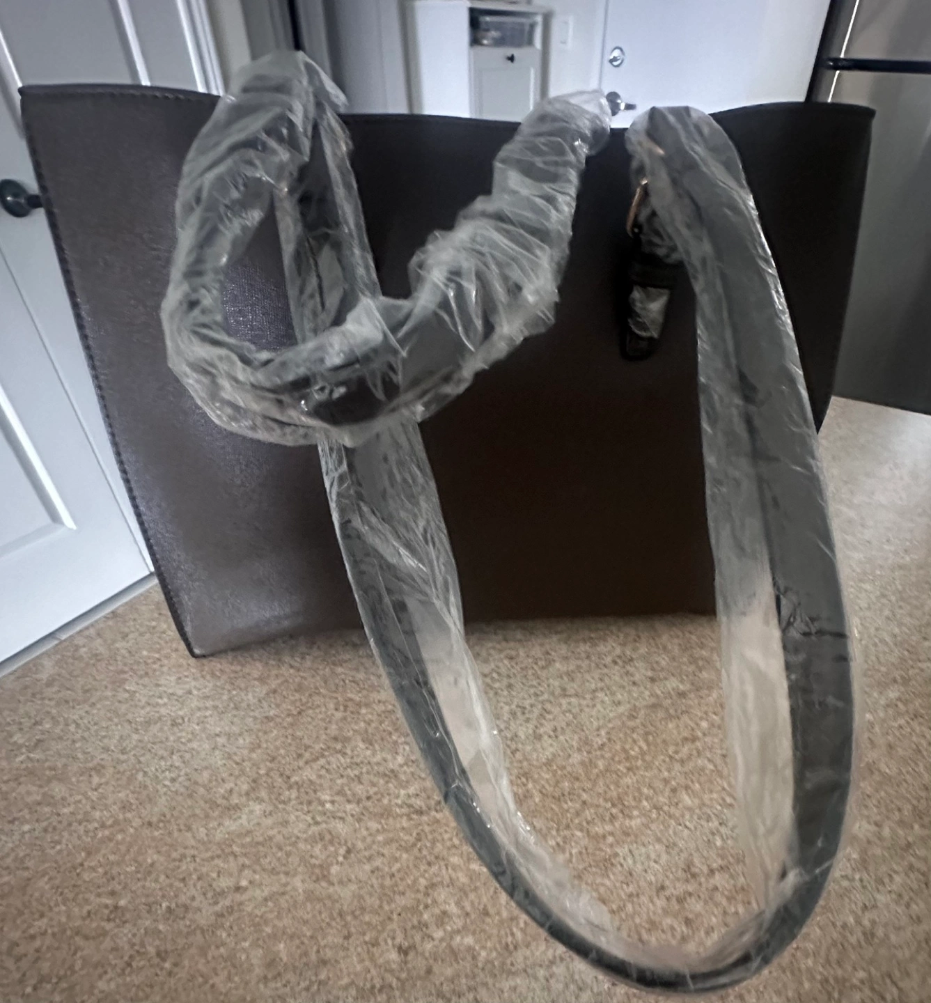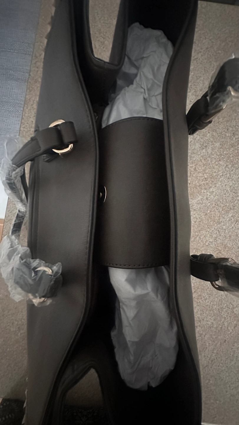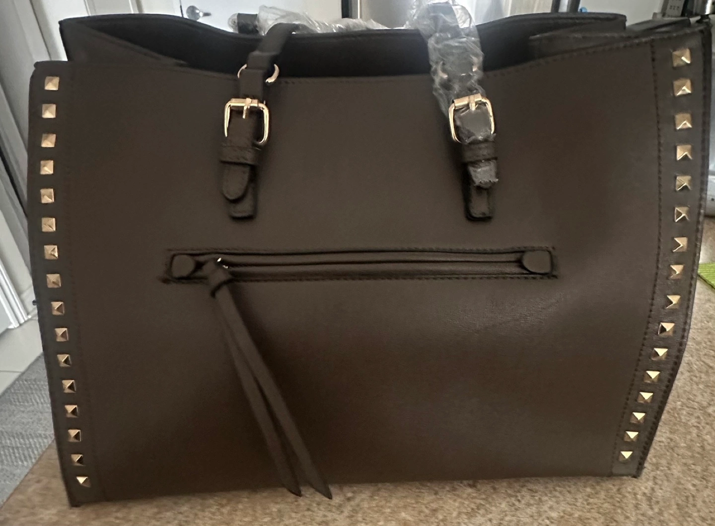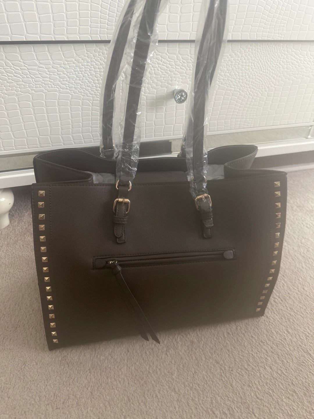 Brown tote bag with gold accents and studs. Has two top handles with a zipper closure.