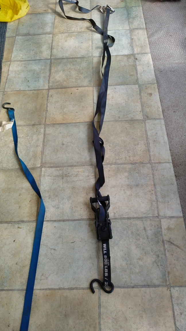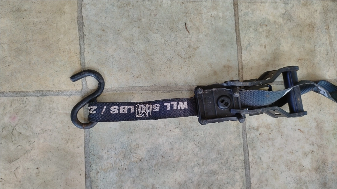 Tie down strap with a hook on one end and a ratchet on the other.