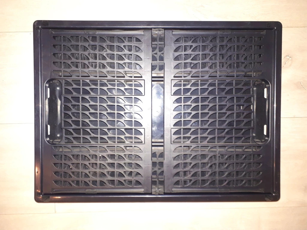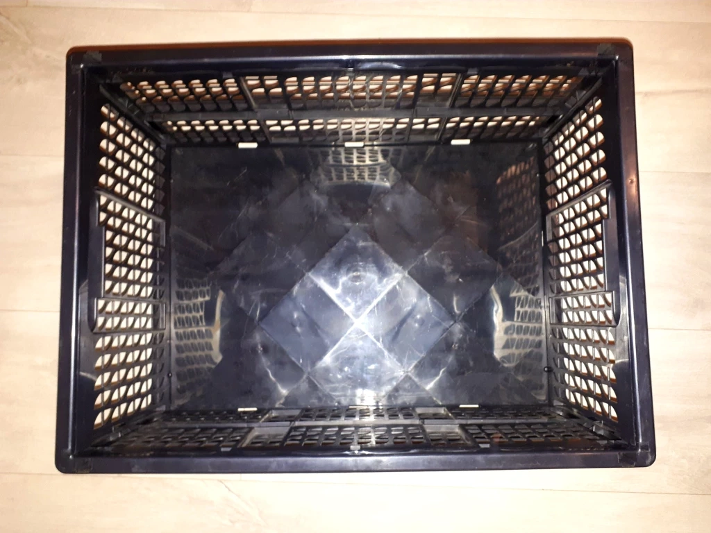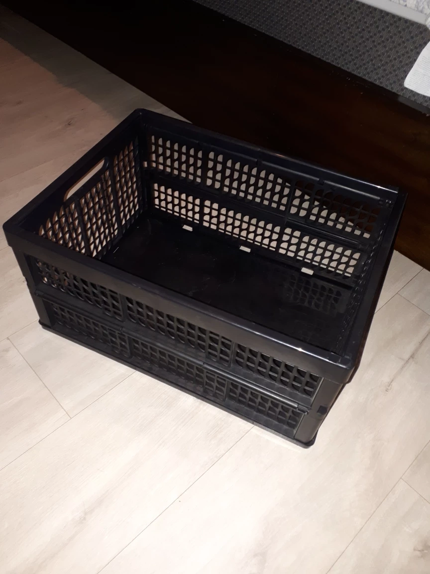 Black plastic crate with handles on the sides. Collapsible for easy storage. Good condition. 9"H x 13.5"W x 16.5"L