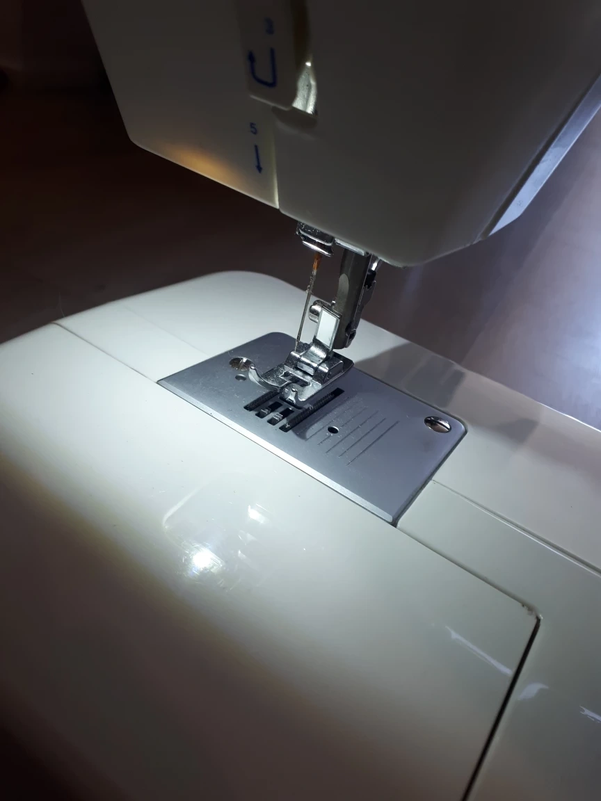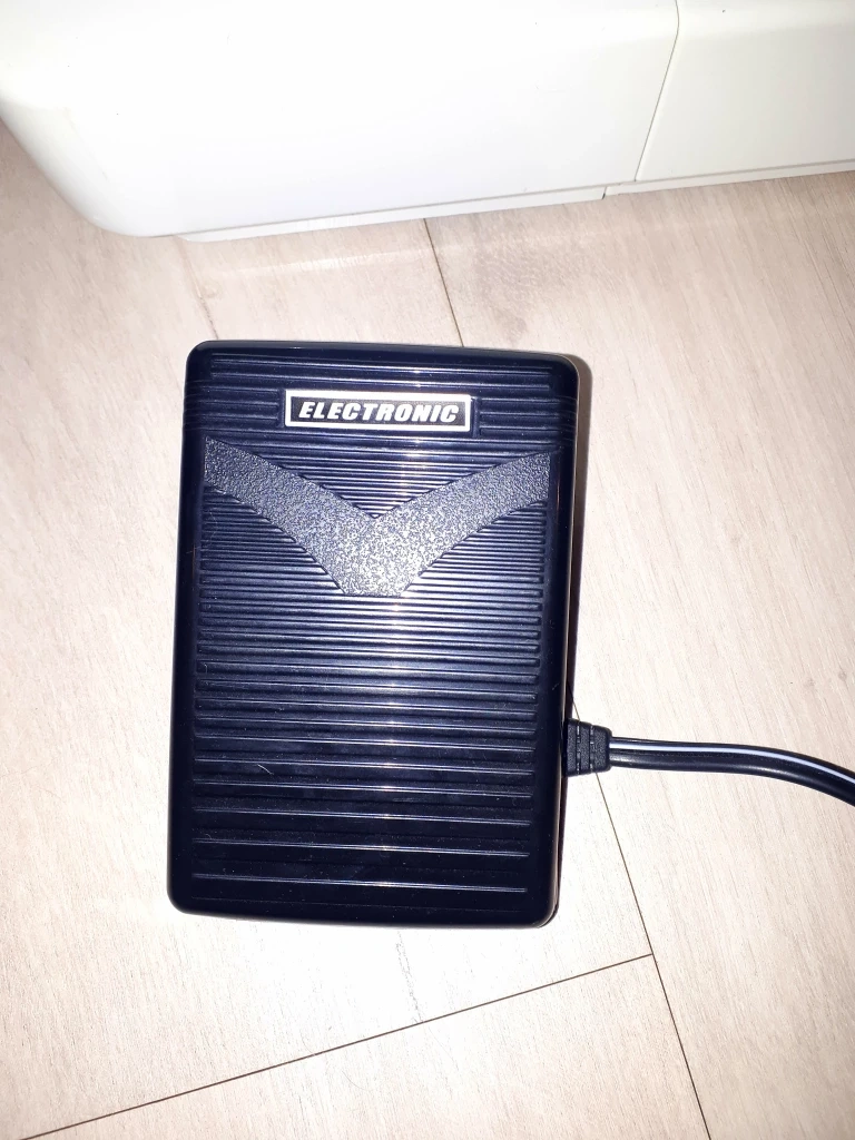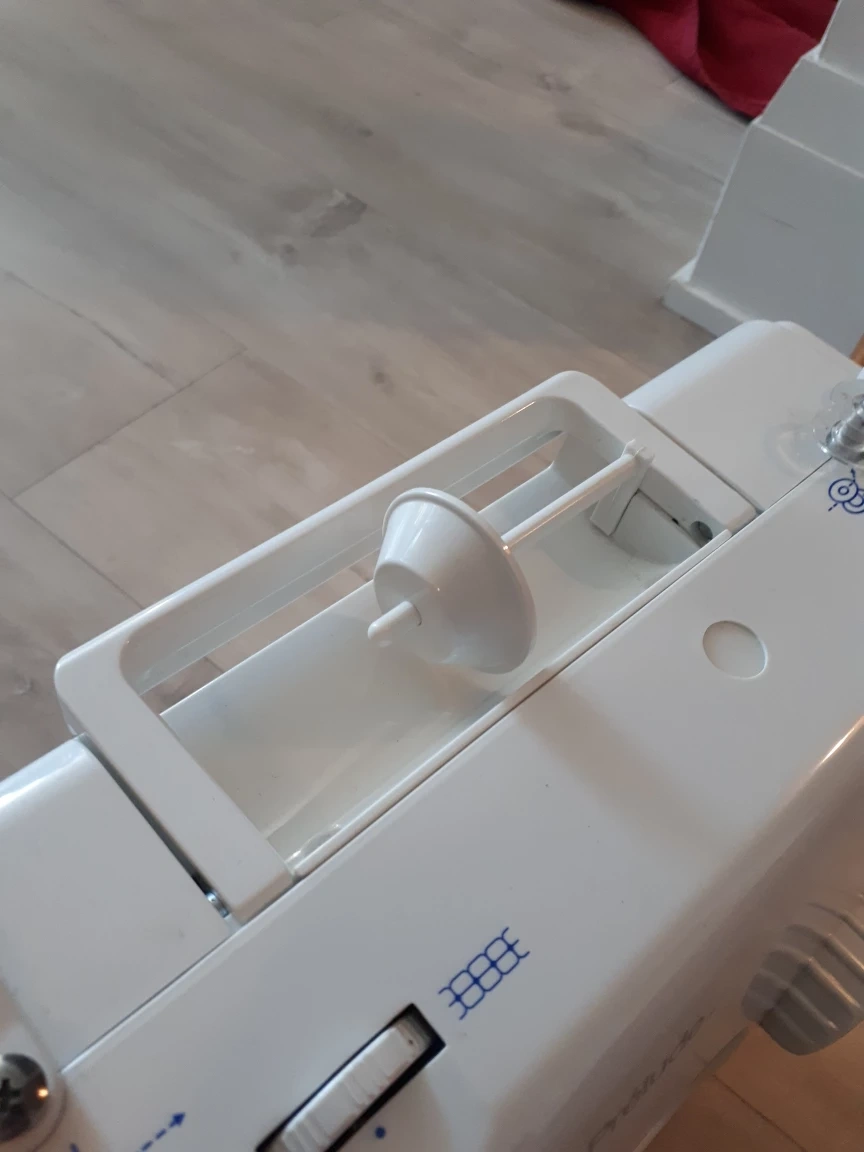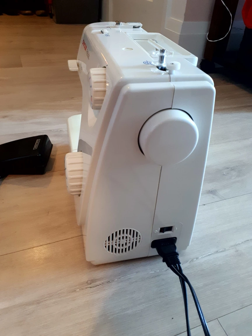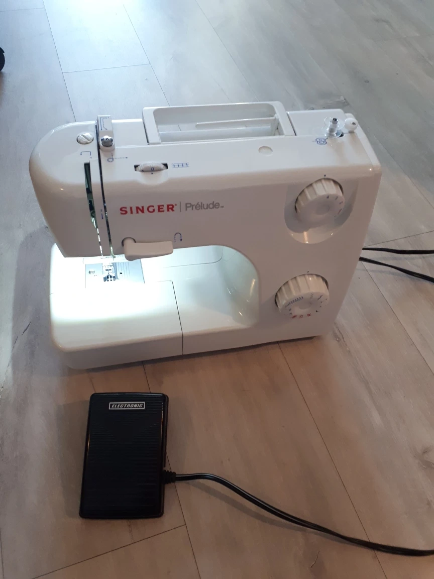 White Singer Prelude sewing machine with foot pedal, power cord, and bobbin. Comes with a variety of stitch options and functions.