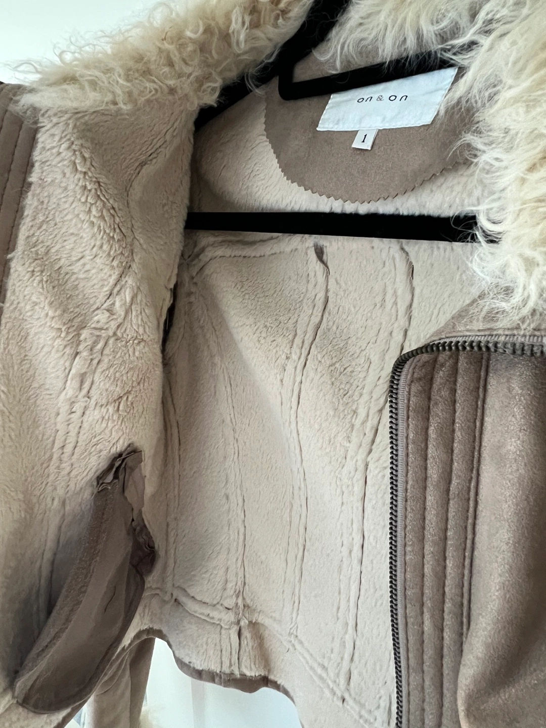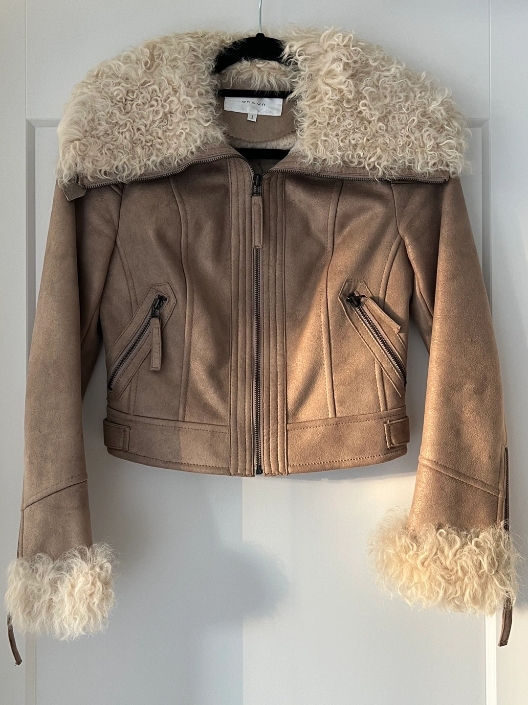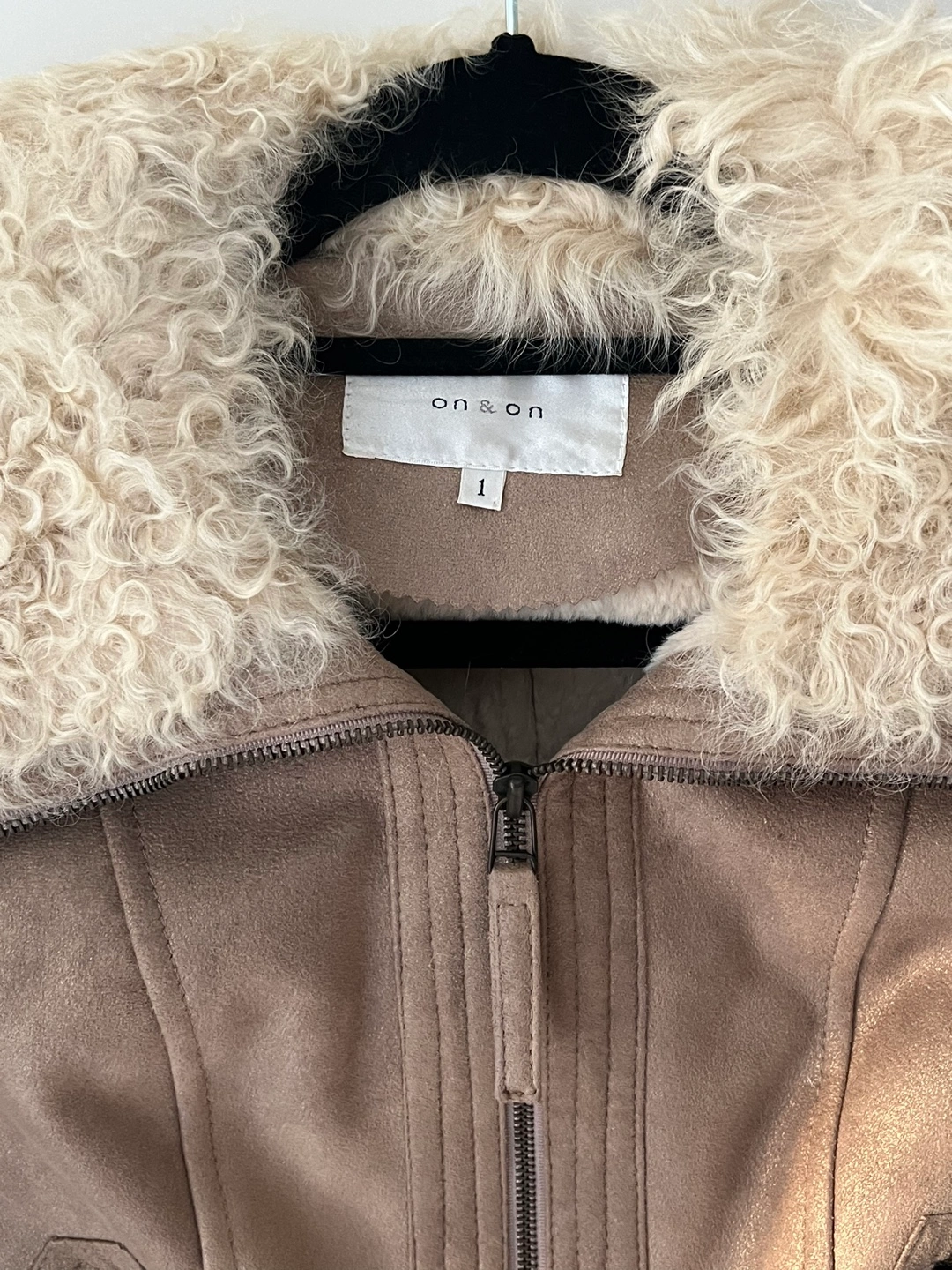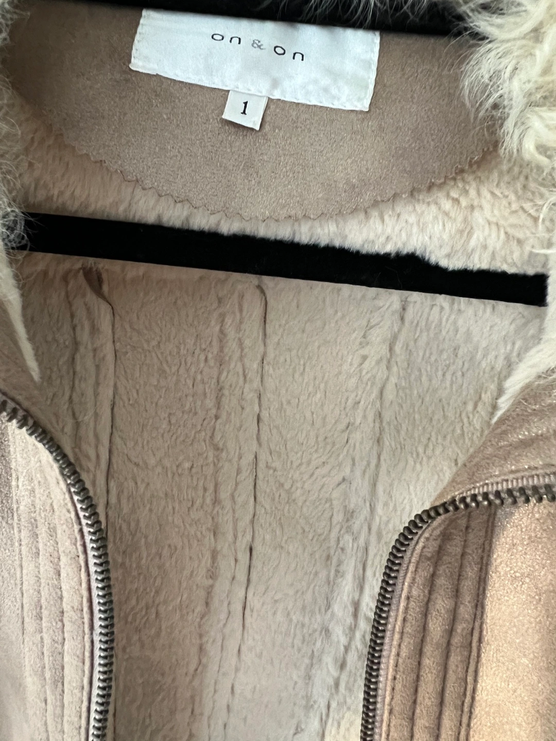 Gold light brown real suede jacket with real fur collar and cuffs. Size 1 which is for XS/S. Has zipper pockets and a zipper closure. I’d love to keep it if it fits me, so lovely! On & On is a Korean brand.