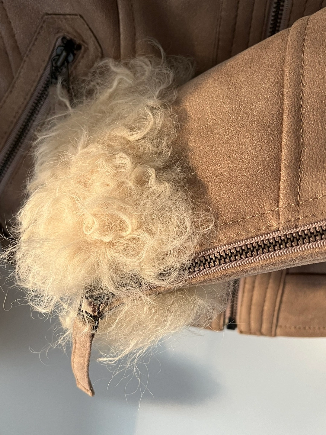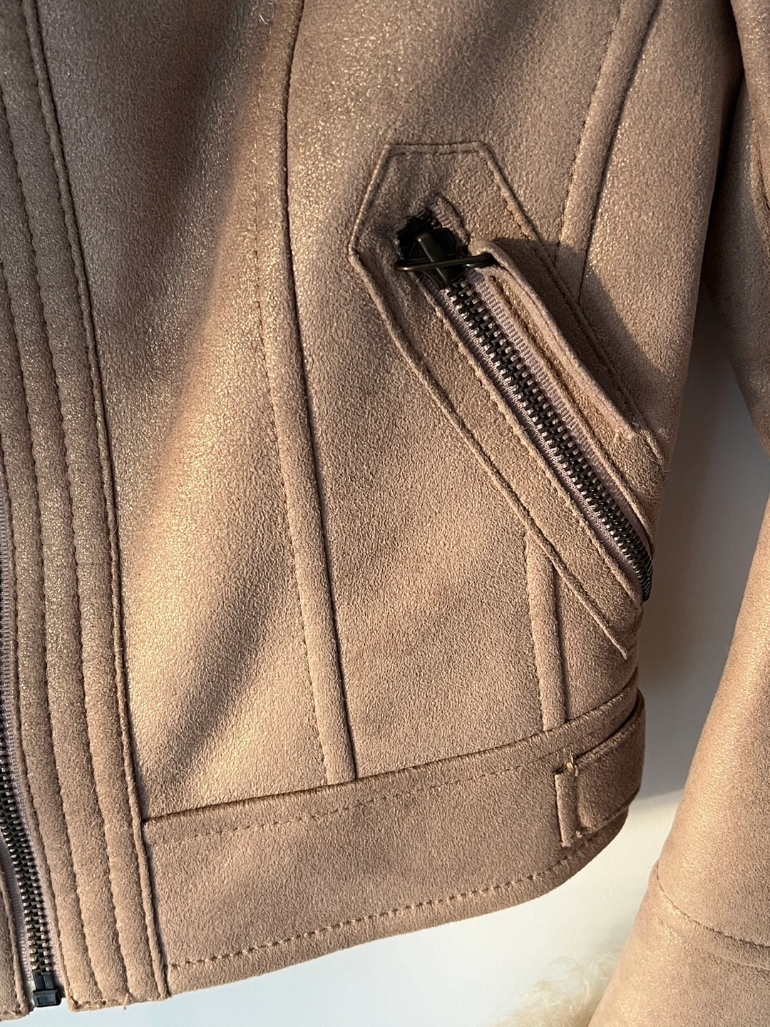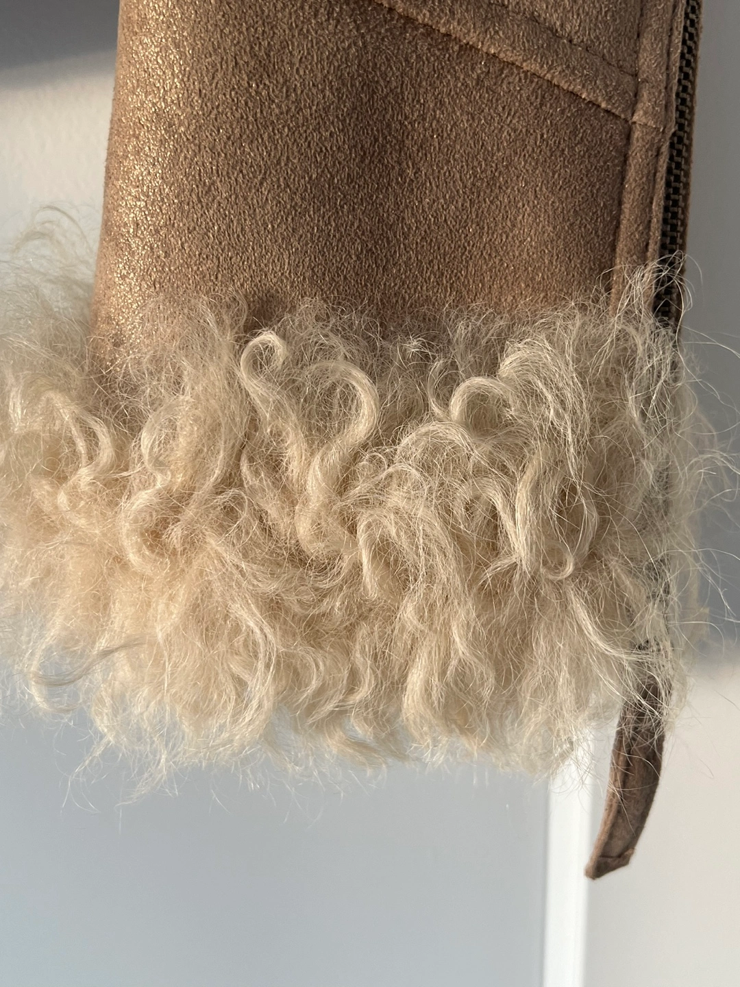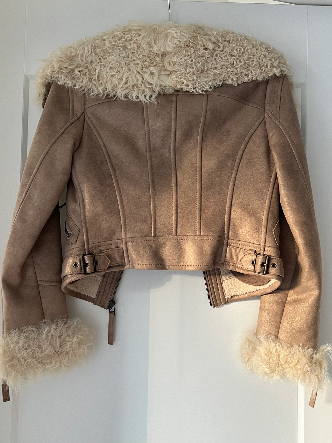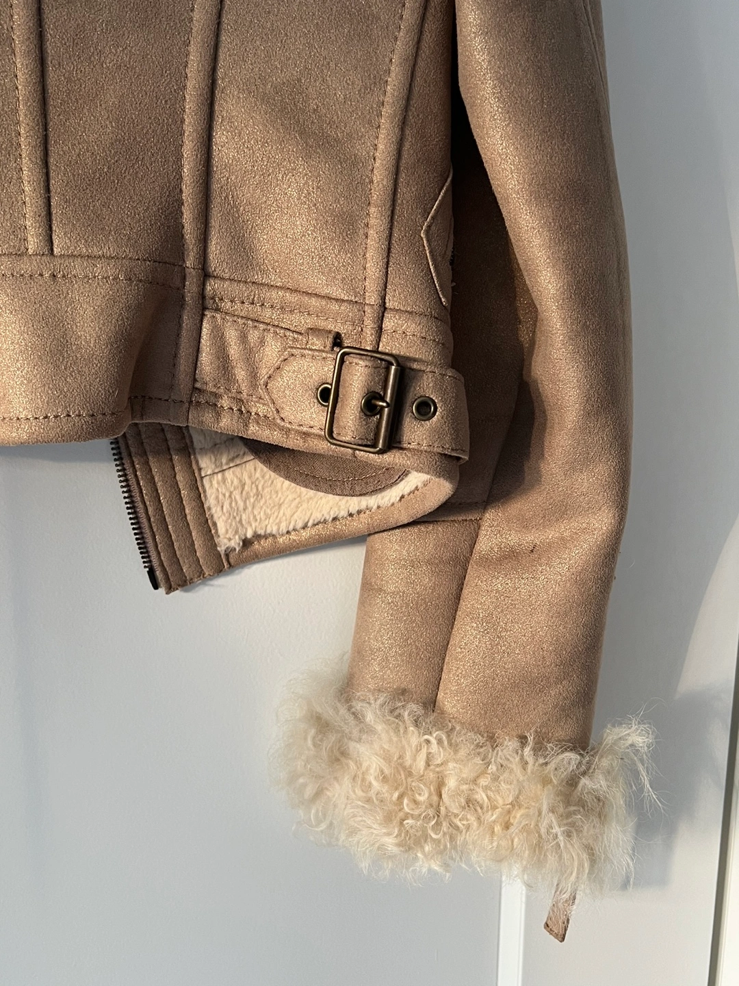 Gold light brown real suede jacket with real fur collar and cuffs. Size 1 which is for XS/S. Has zipper pockets and a zipper closure. I’d love to keep it if it fits me, so lovely! On & On is a Korean brand.