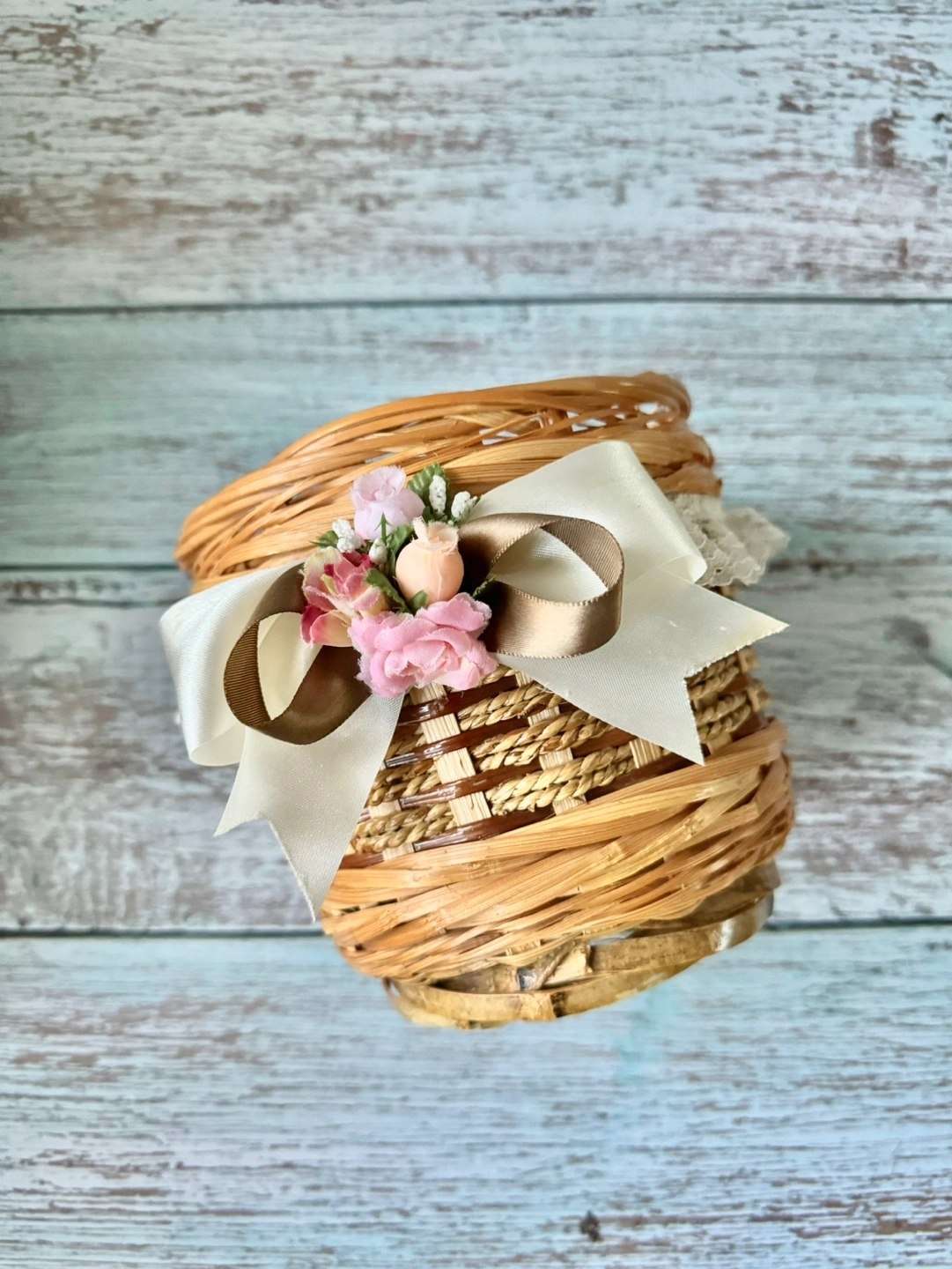 Small wicker basket with a white bow. Decorative flowers on the bow. Great for small plants or other decor.