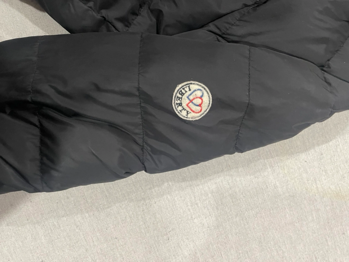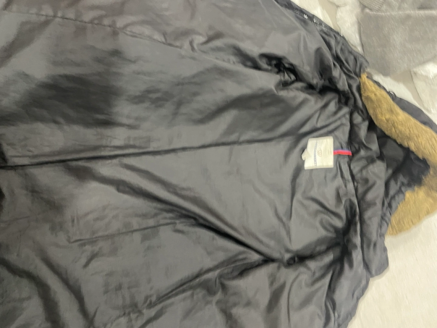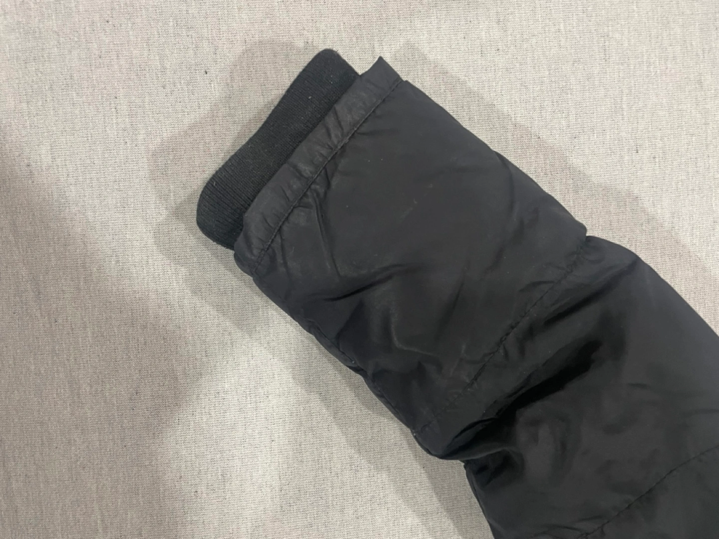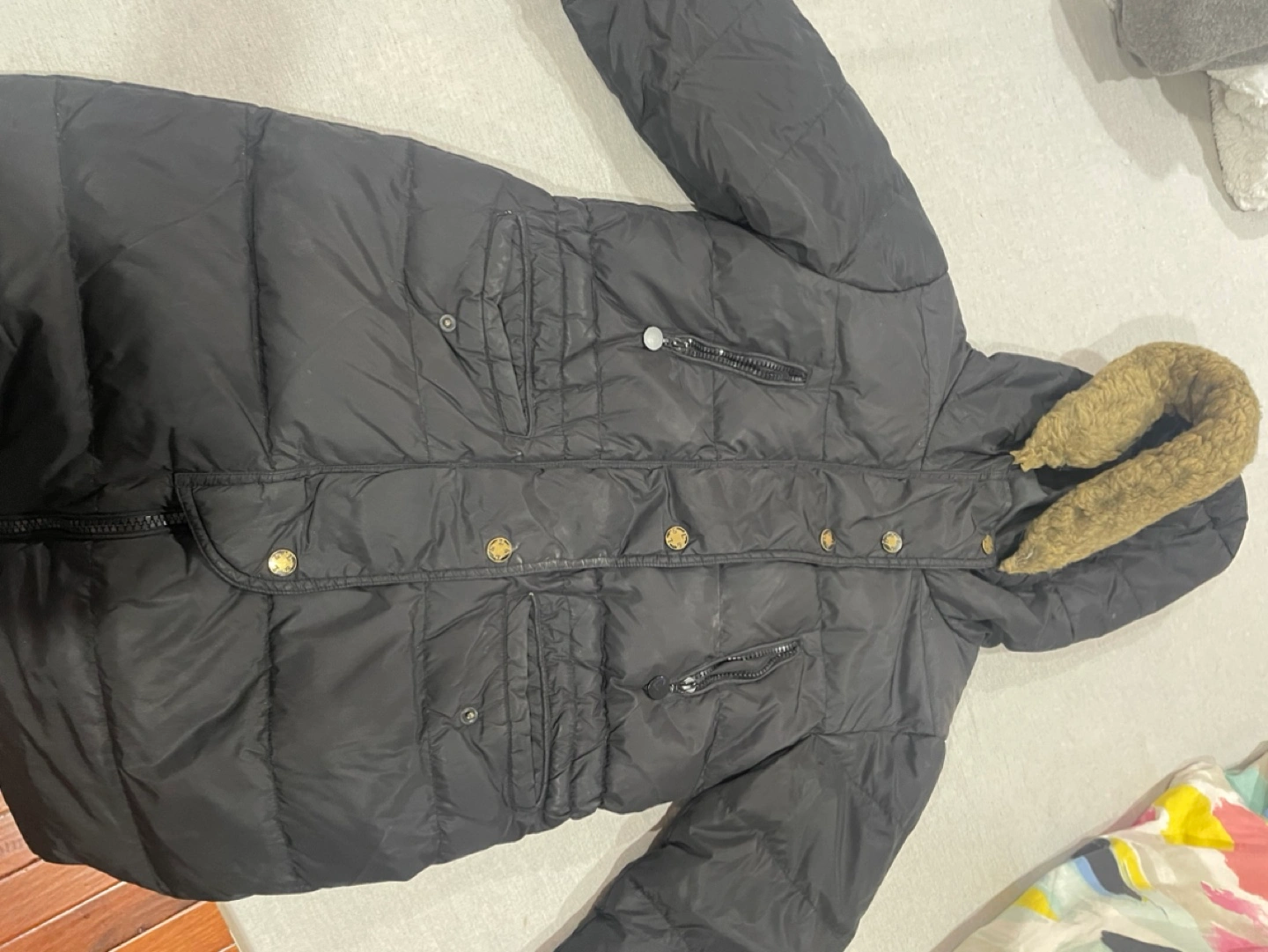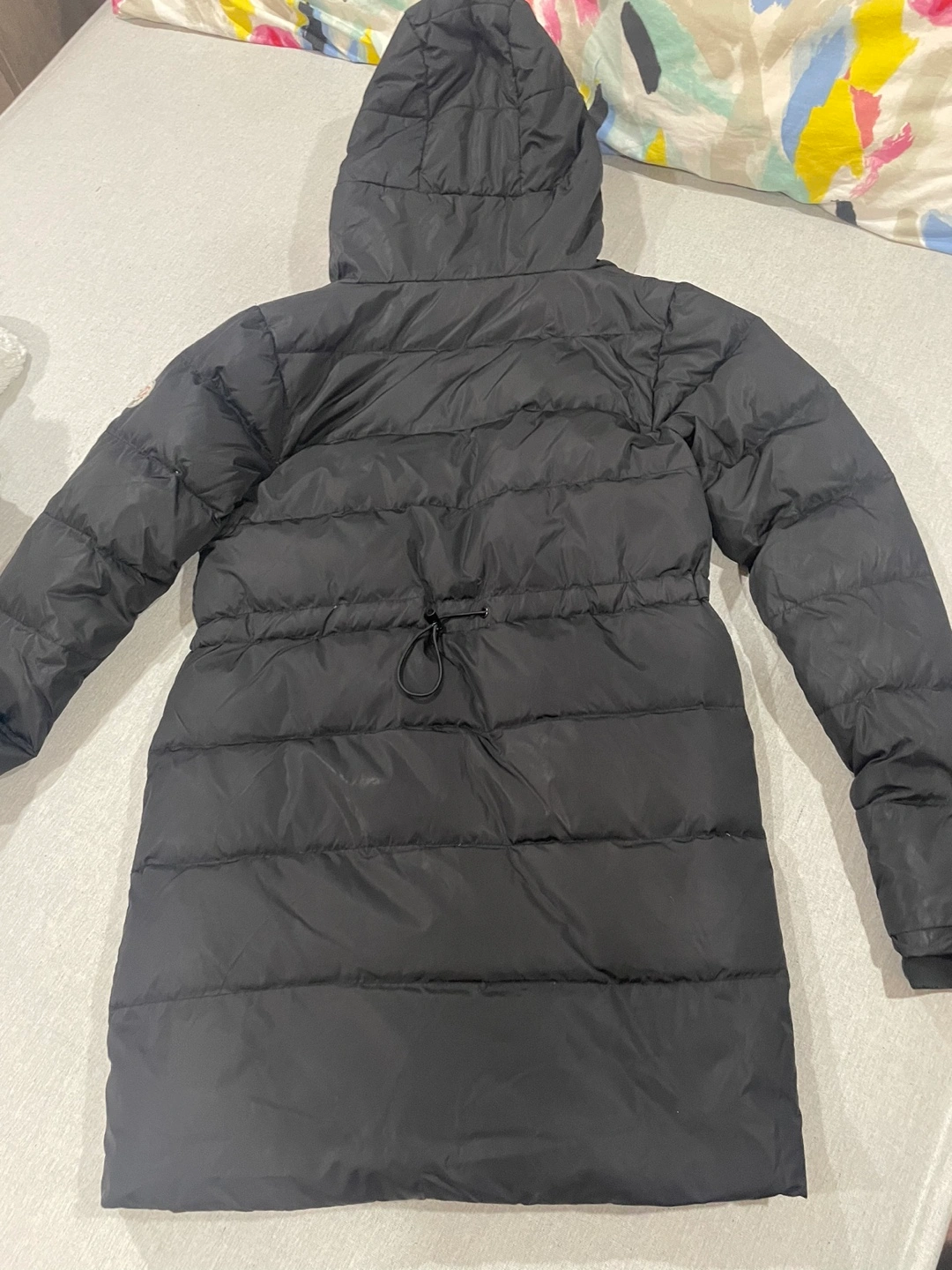 Black long puffer jacket with a hood. Has a zipper closure and button accents on the front. Has pockets on the sides. Very warm and comfy. Perfect for canadian winters.