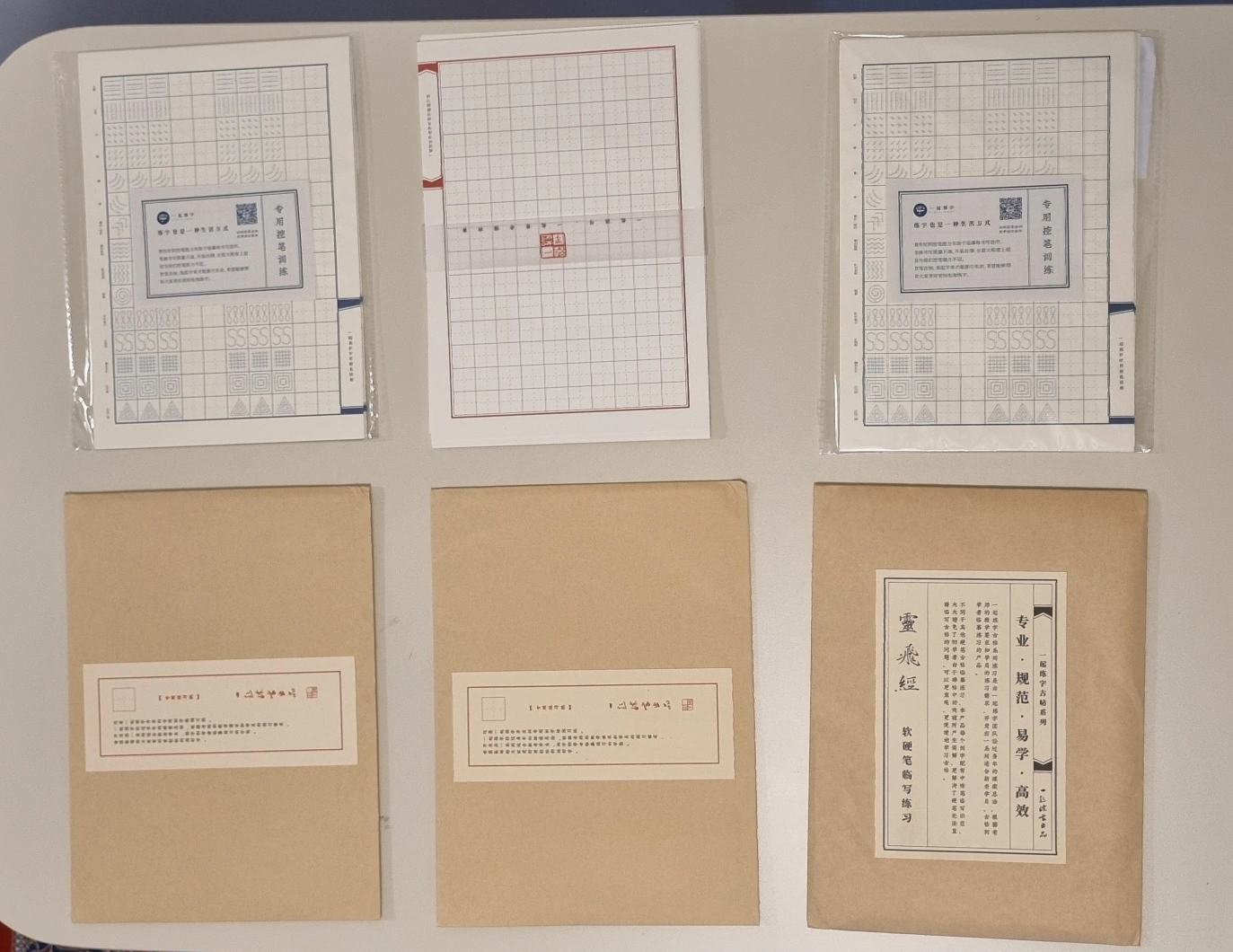 Yiqianzi Chinese Character Practice Calligraphy Paper - 5 Pack. Includes 3 packets of paper with grids and a separate instruction packet with additional writing information.
