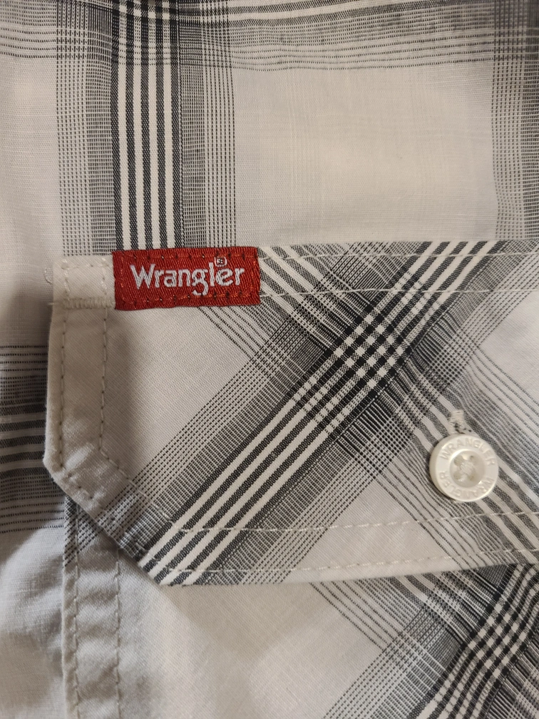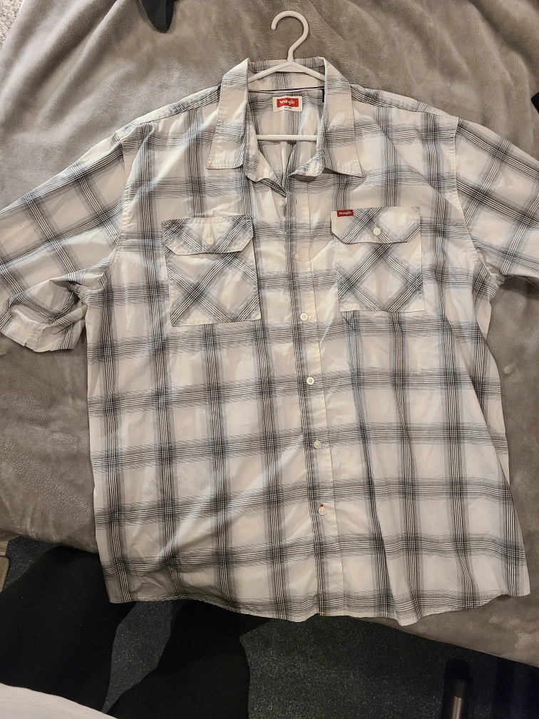 White and black plaid button-up shirt with short sleeves and two chest pockets. Size 2XL.
