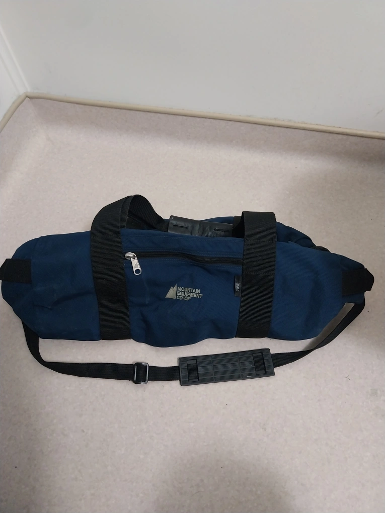 Blue duffle bag with black straps and a zippered pocket on the front. Has a shoulder strap.